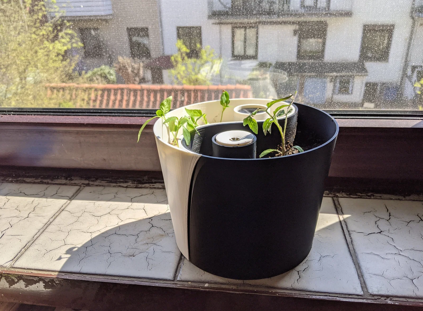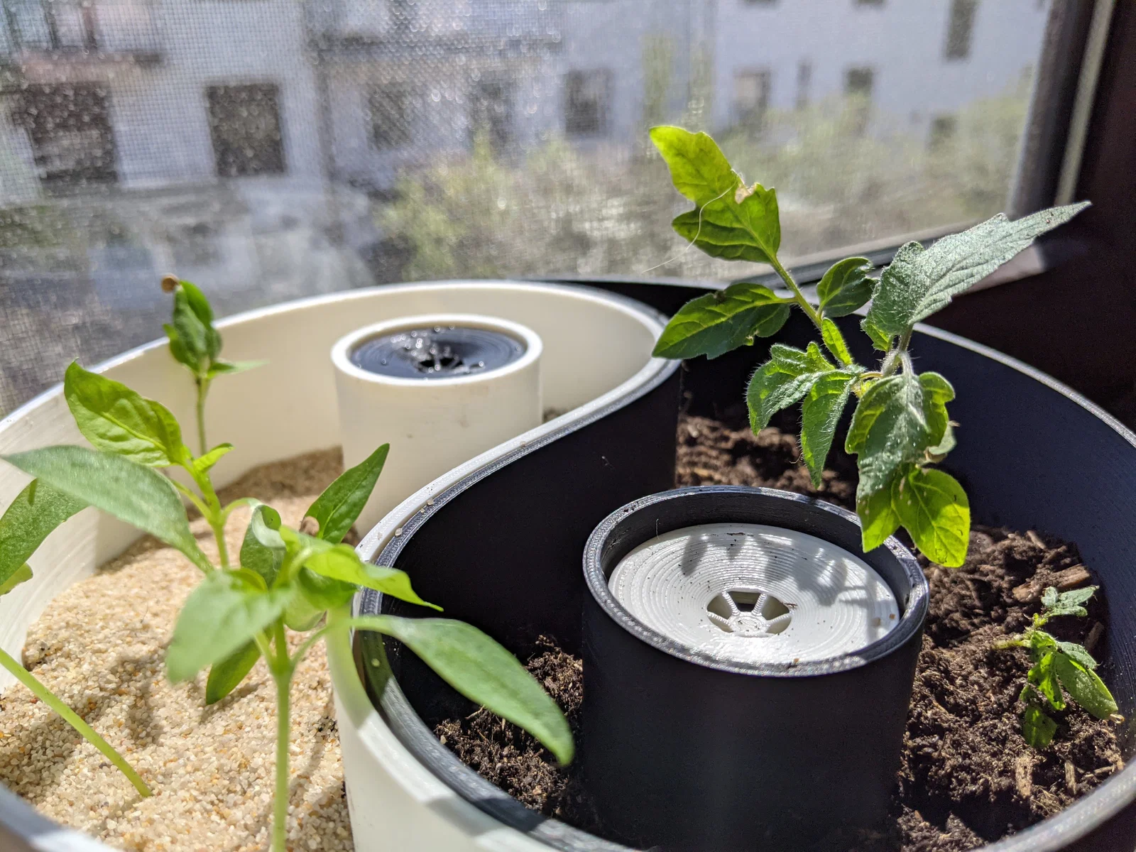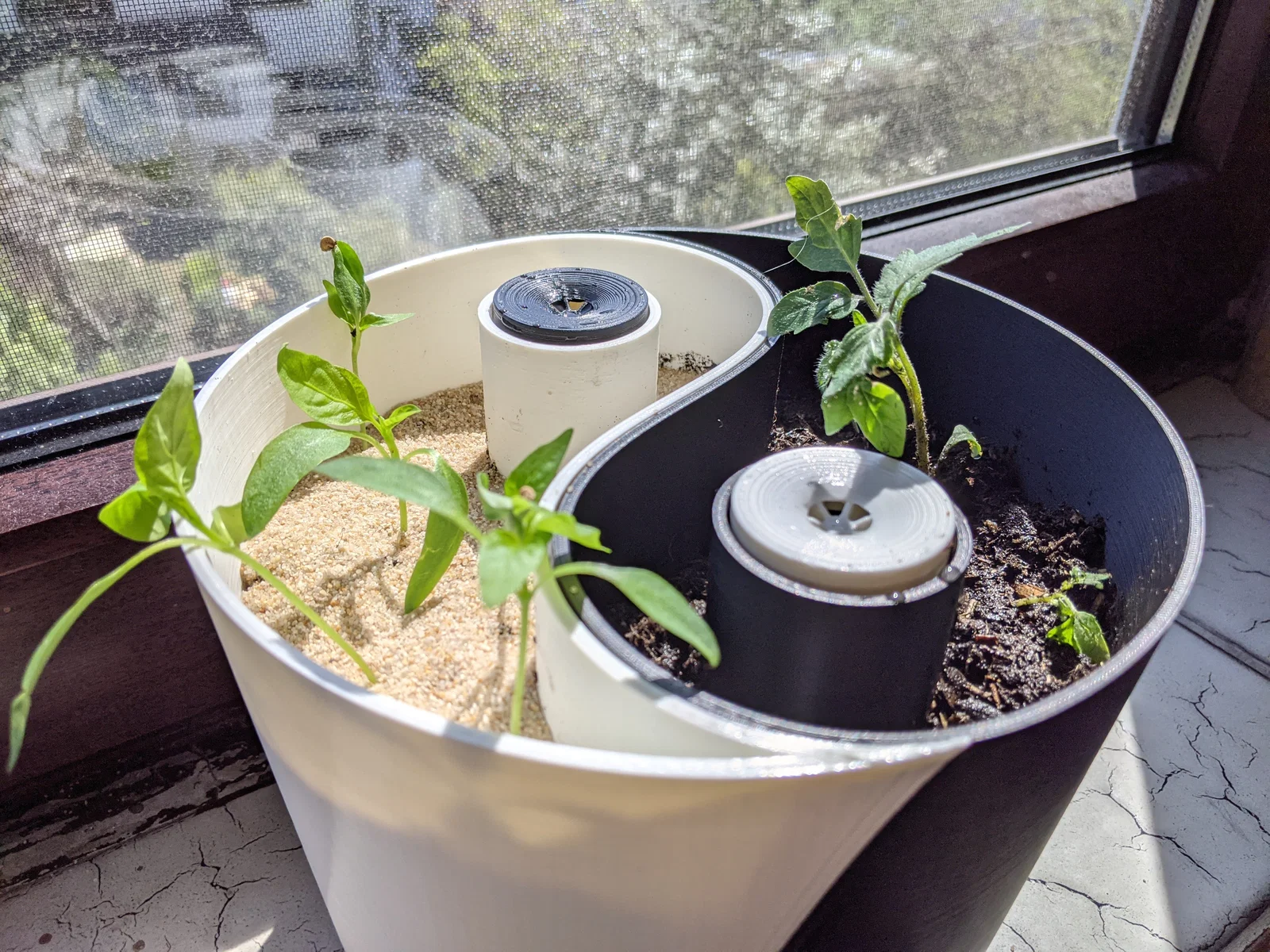 Chậu cây lấy cảm hứng từ biểu tượng Âm Dương này được trang bị bộ chỉ báo mực nước và không gian rộng rãi để trồng một hoặc hai cây.