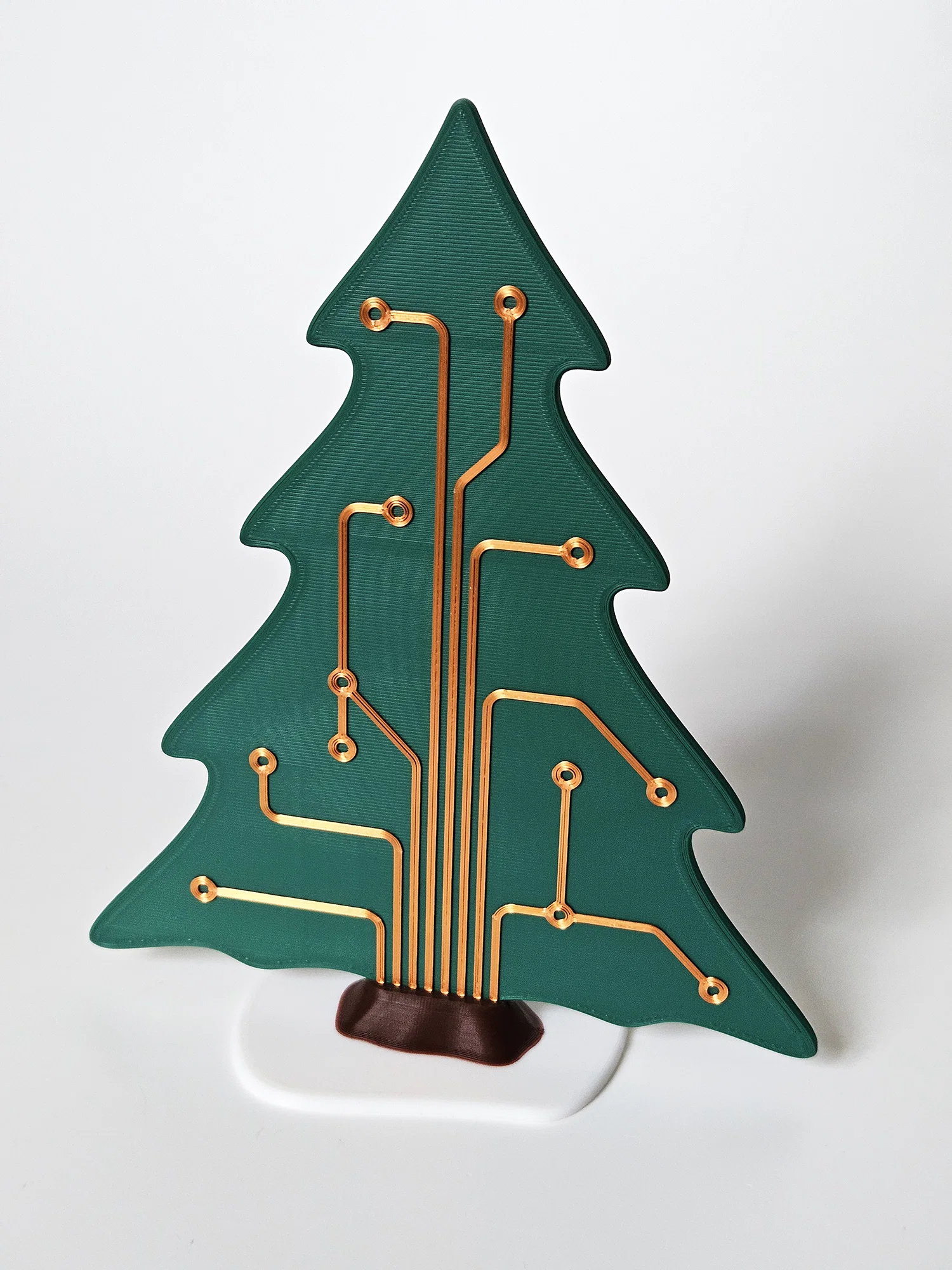 Một cây thông Noel nhiều màu với các đường mạch PCB ở mặt trước. Mô hình này không yêu cầu bộ in đa vật liệu (multi material unit) để in. Cây cao khoảng 22 cm, rộng 18 cm và chỉ cần lắp vào đế. Nó vừa với các bàn in phổ biến kích thước 220 x 220 mm khi xoay 45°.