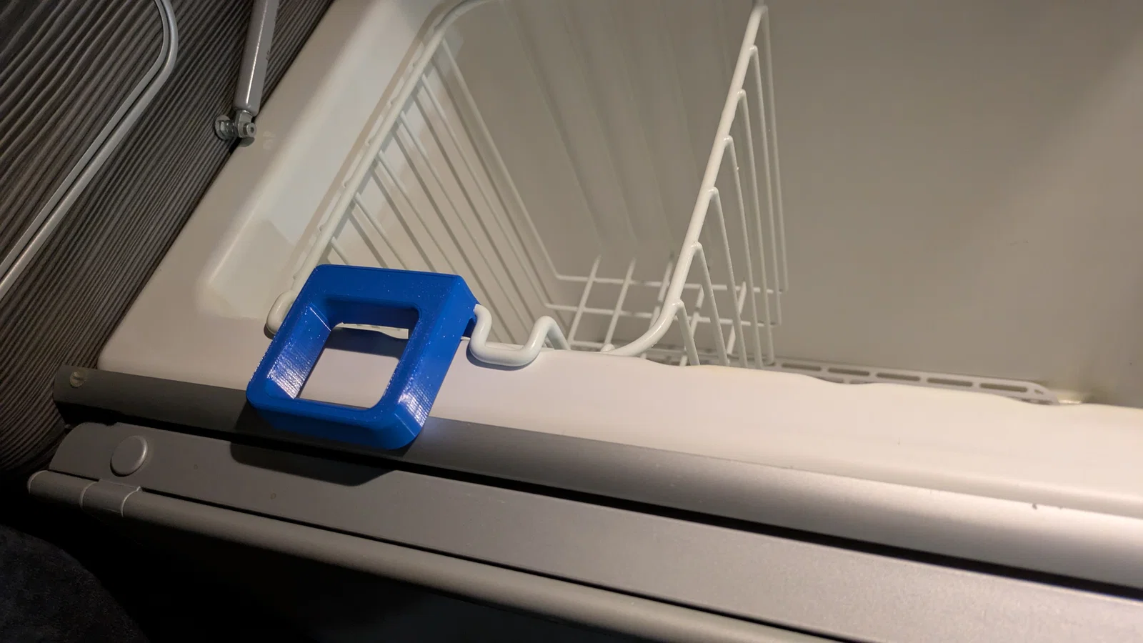 Phụ kiện giúp giữ hé nắp tủ lạnh xe cắm trại VW California khoảng 15mm khi không sử dụng, giúp tủ luôn thông thoáng, tránh ẩm mốc và mùi hôi. Thiết kế kẹp vào giỏ đựng đồ, cực kỳ tiện lợi cho các chuyến đi.