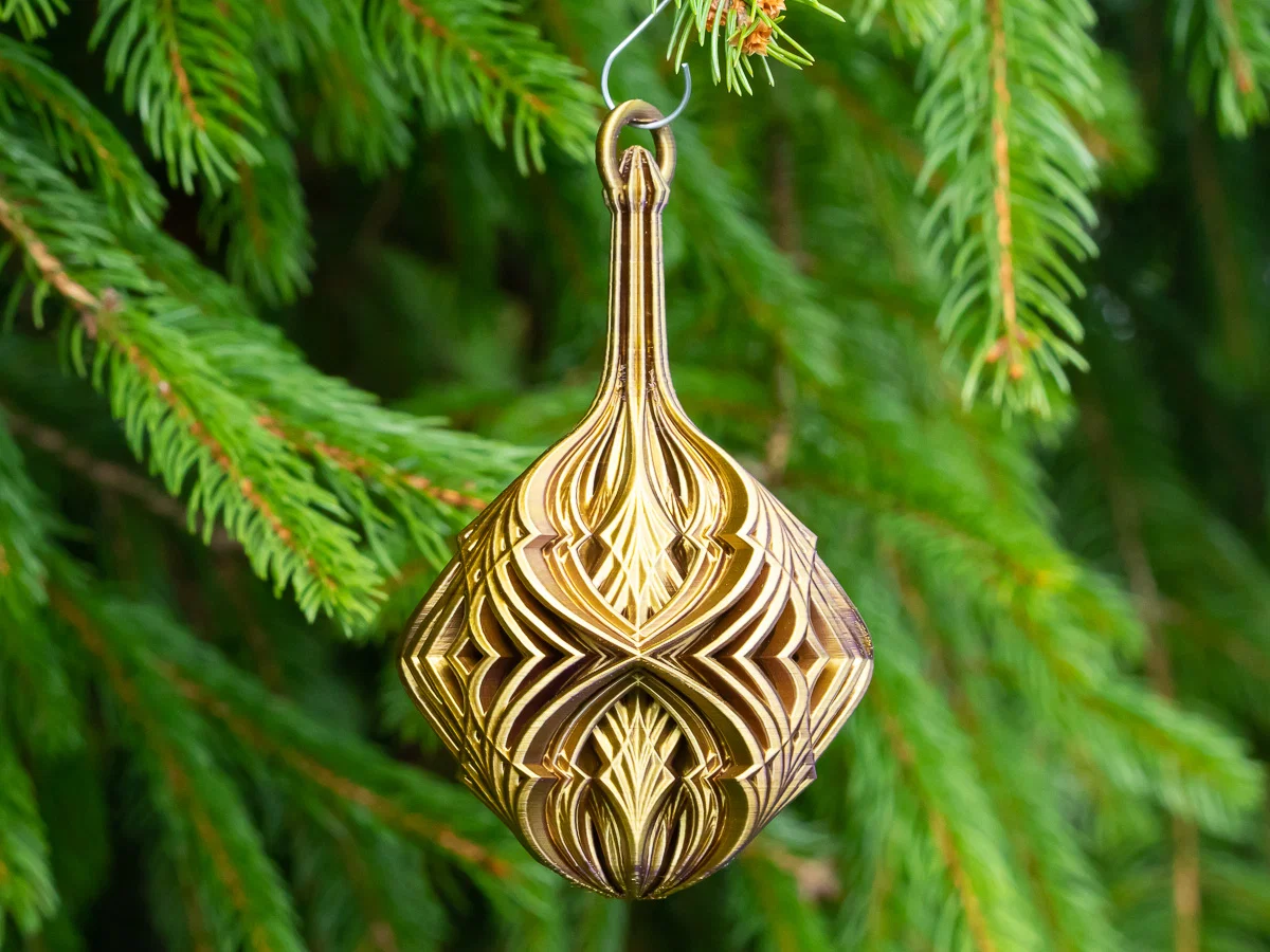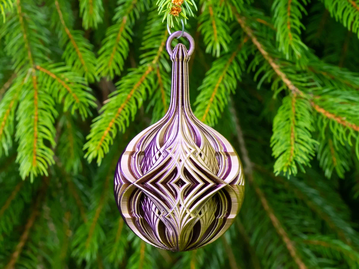 Đây là mẫu trang trí Giáng sinh tinh tế với các họa tiết hình thoi đan xen trên bề mặt quả cầu có cuống. Mẫu này được in liền một khối. Bạn cần dùng một ít infill, nhưng chỉ ở một vài vị trí nhất định thôi.