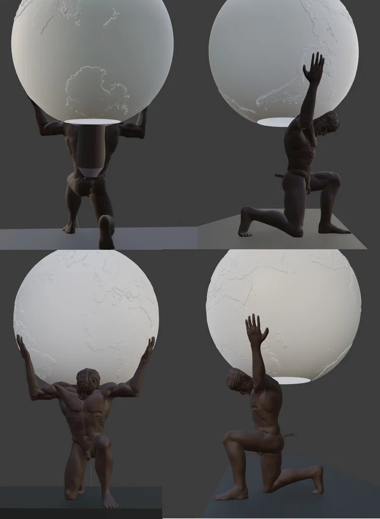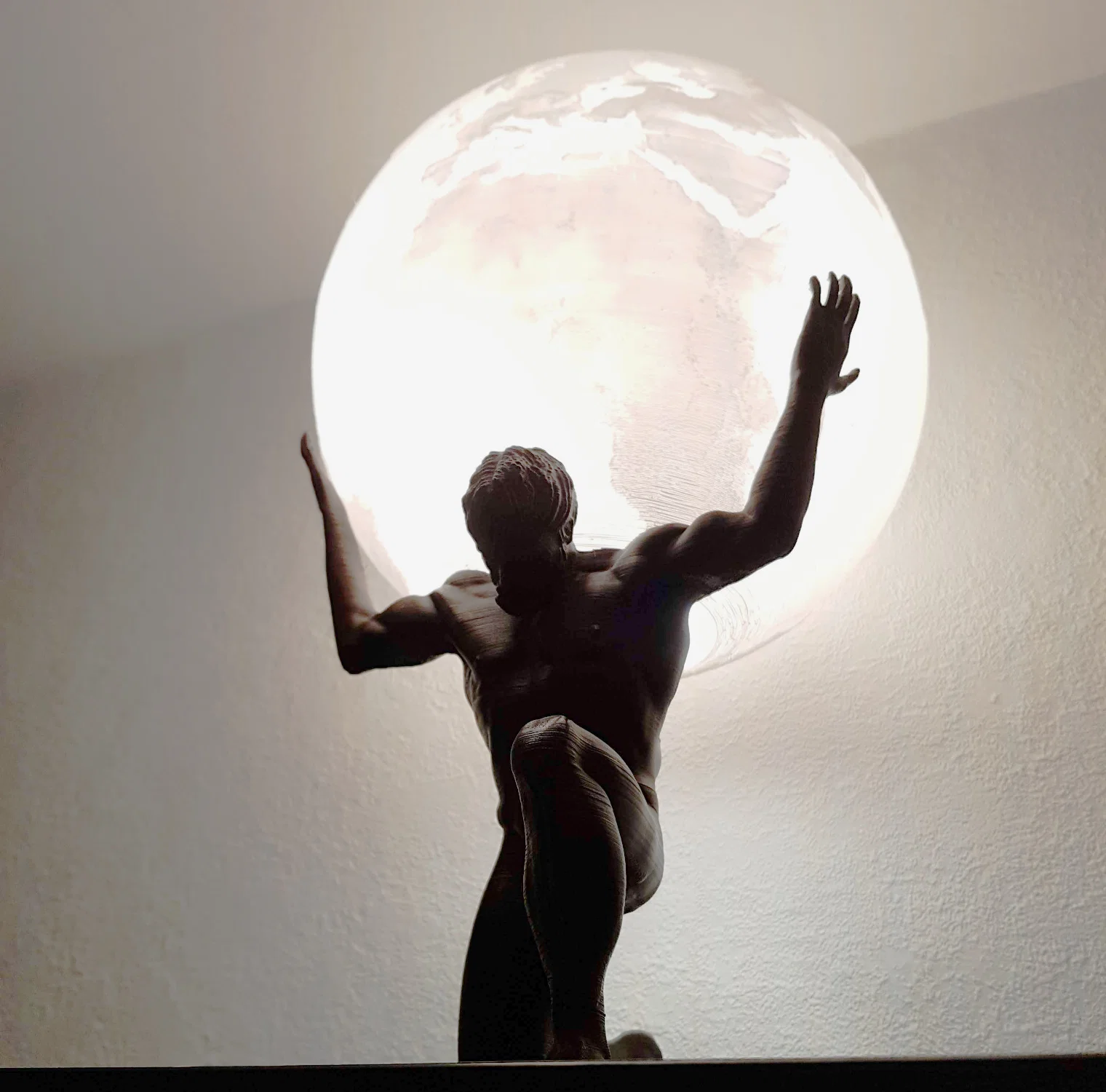 Một mẫu điêu khắc Atlas có khoét chỗ để gắn đèn, đang nâng một quả địa cầu lithophane.