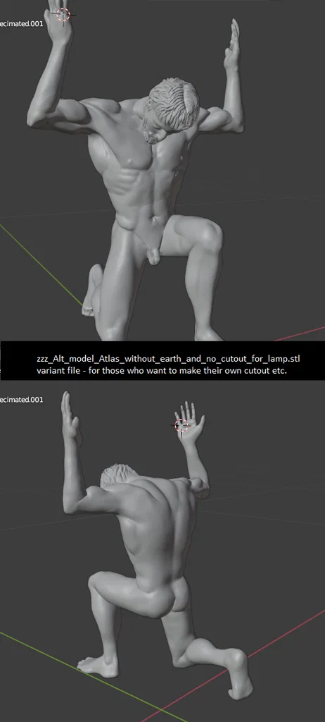Mẫu Atlas lamp: tượng Atlas nâng quả địa cầu lithophane có khoét lỗ để lắp đèn. Có bản 100% và “mmm_75”, hướng dẫn dán lắp đơn giản. Lưu ý tắt “Compensate Wall overlaps” trong Cura và không rescale quả địa cầu.