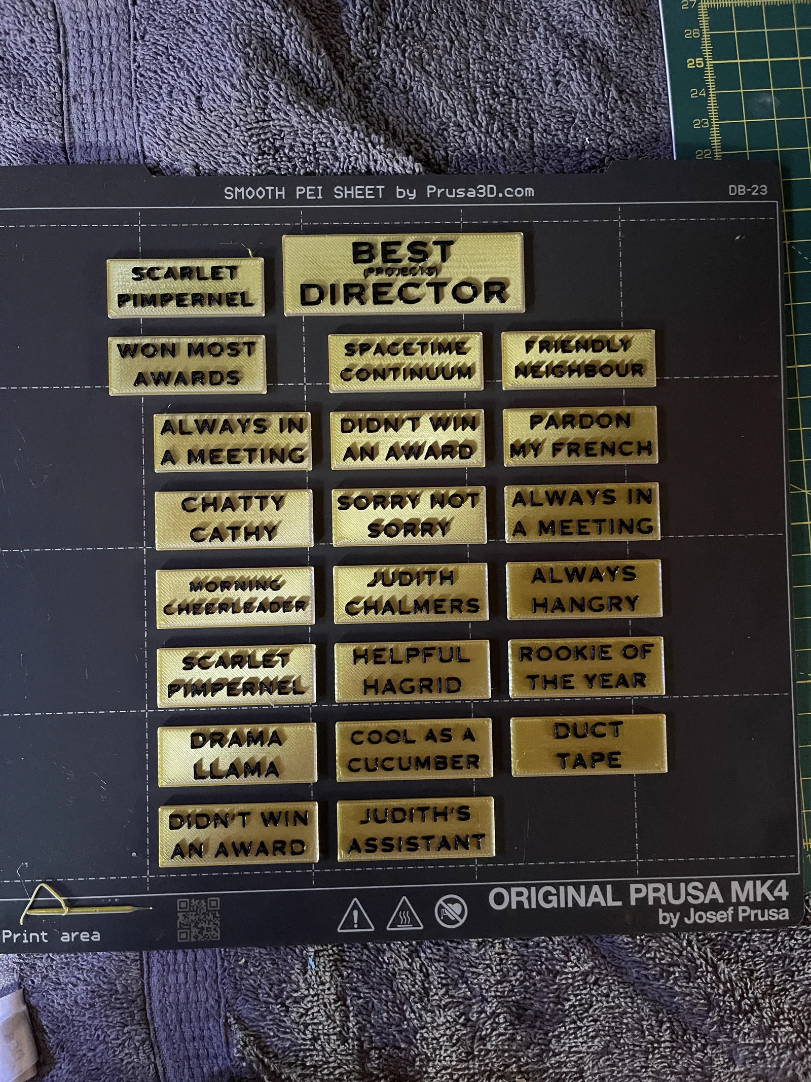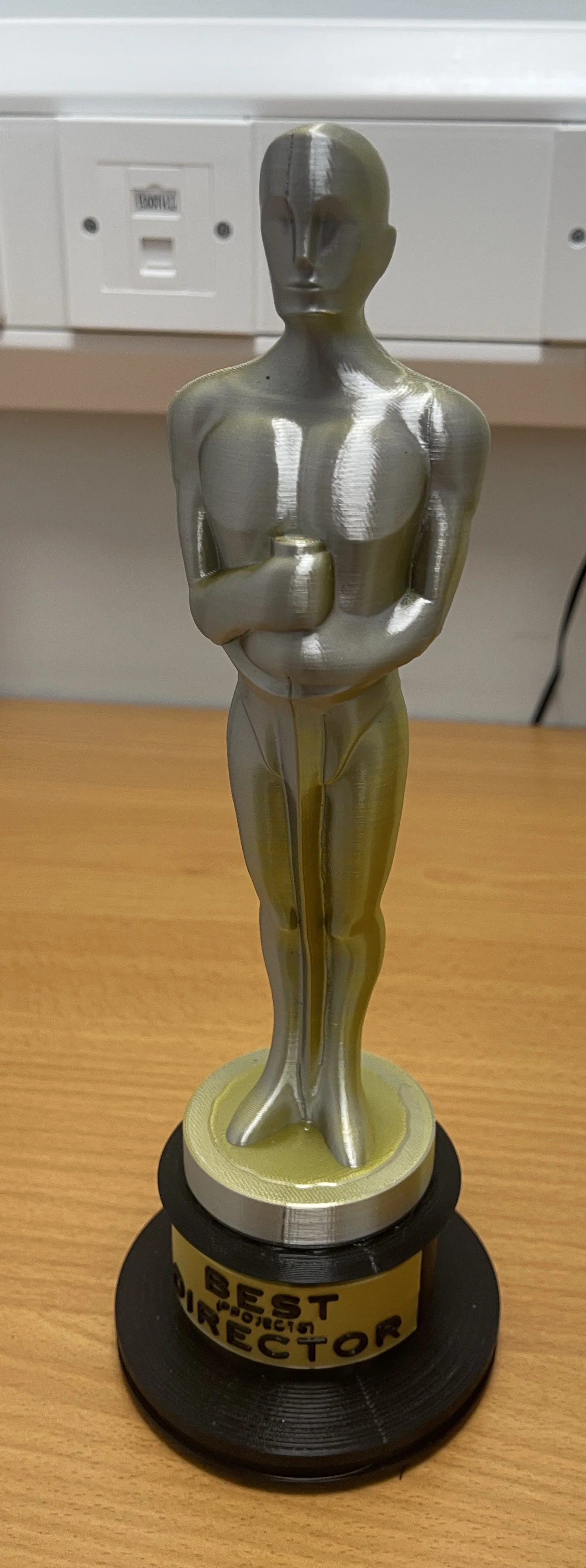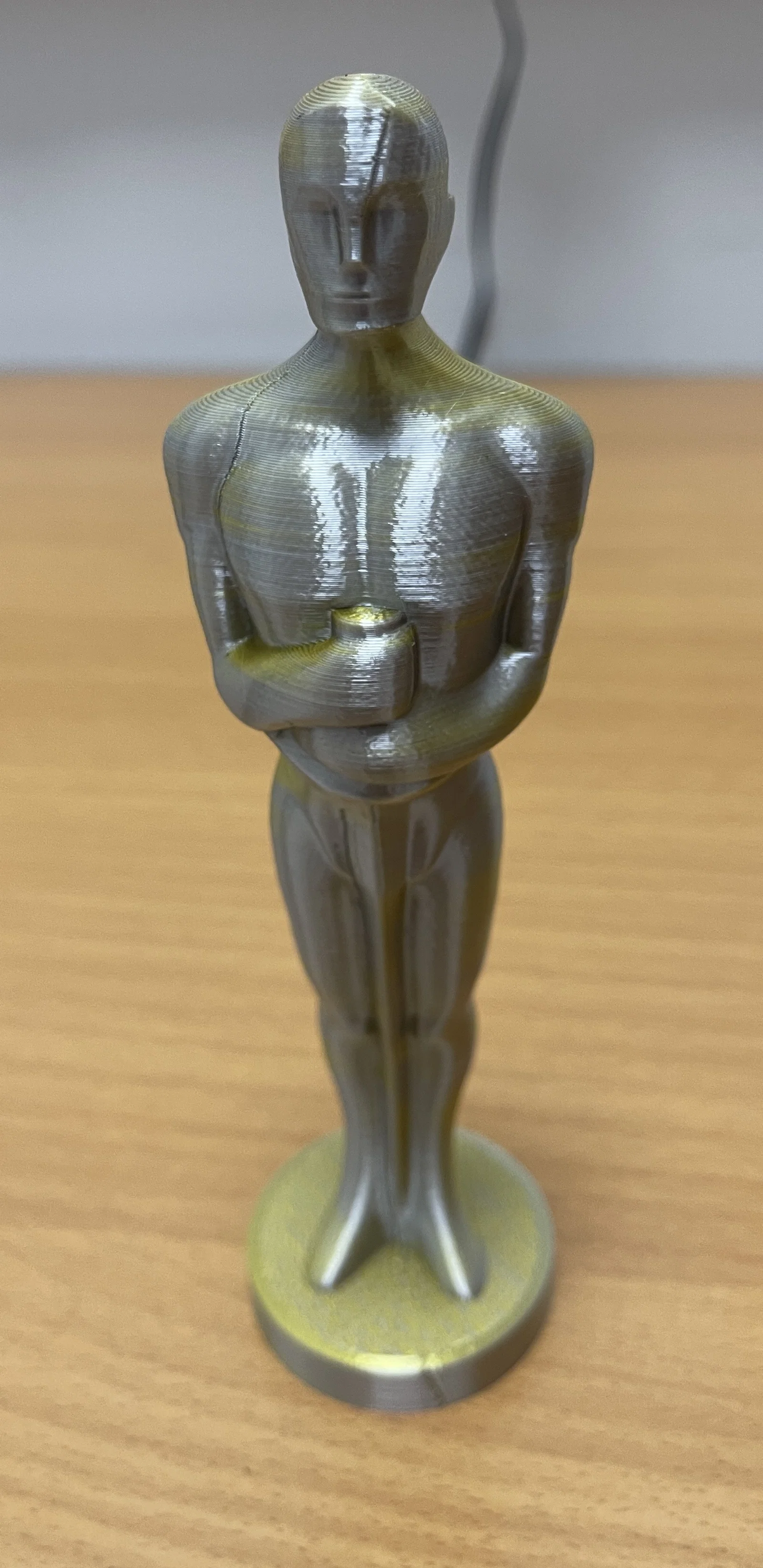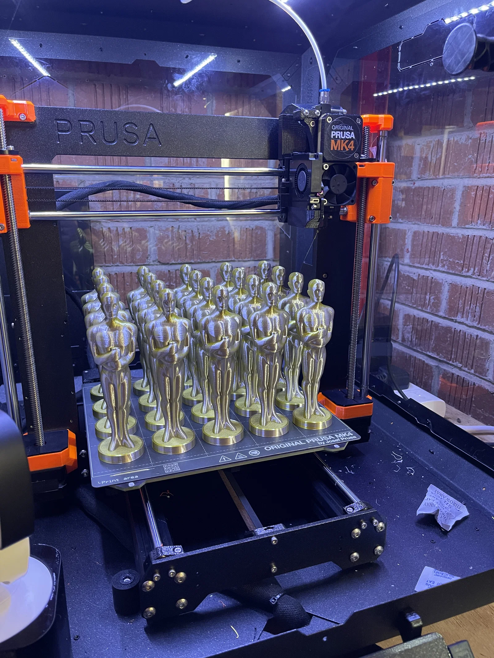 Bản remix tượng Oscar: tách tượng khỏi đế và scale còn 65% để xếp được 20 tượng trên build plate. Kèm file đã slice cho silk PLA (tượng), black PLA (đế) và label 3mf (20 nhỏ + 1 lớn).