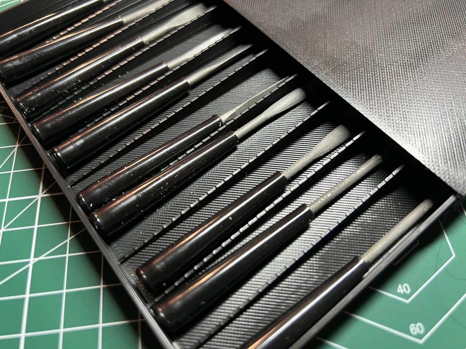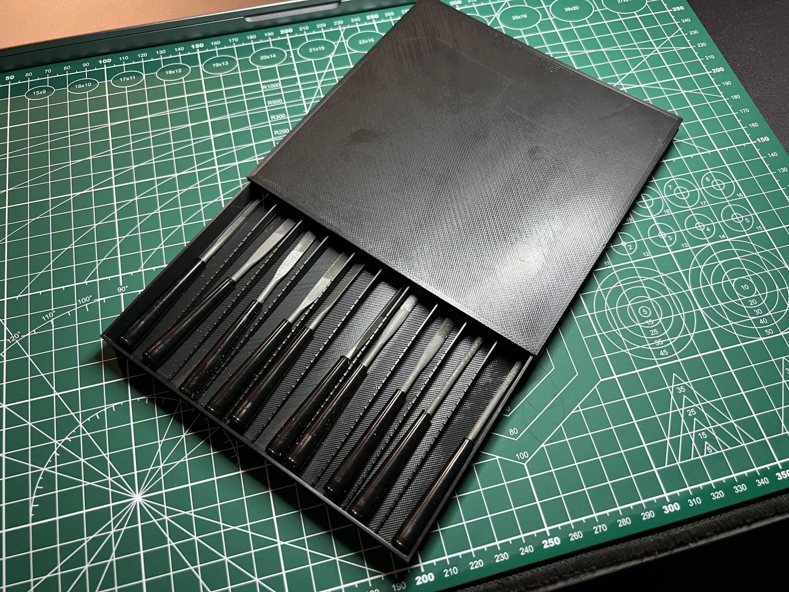 Trong một thời gian dài, tôi cần một số dụng cụ mài, vì vậy cuối cùng tôi đã mua chúng, nhưng chúng không đi kèm với hộp lưu trữ nào, vì vậy tôi đã nhanh chóng làm một cái cho riêng mình. Vừa vặn hoàn hảo cho nhu cầu của tôi trong ngăn kéo bàn làm việc.
