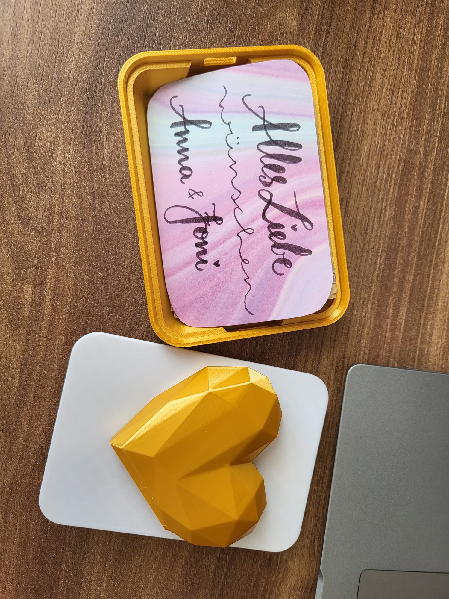 Sản phẩm này là sự kết hợp tinh tế giữa thiết kế vỏ hộp có khóa an toàn và họa tiết trái tim đa giác (low-poly) nổi bật trên nắp, tạo nên vẻ ngoài hiện đại và bắt mắt. Bạn có thể sử dụng nó để đựng các loại thẻ quà tặng, trang sức nhỏ, hoặc những món quà tinh thần giá trị khác. Khi muốn mở hộp, người nhận cần thao tác với cơ chế trượt khéo léo bên trong, mang lại trải nghiệm tương tác cực kỳ độc đáo mà ít loại hộp quà nào có được.