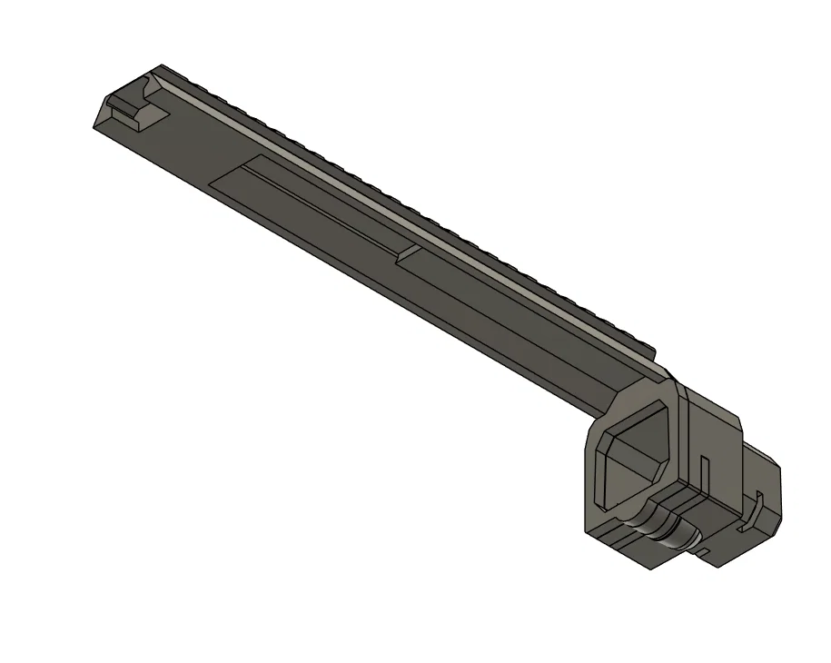 Top rail Picatinny full-length cho Aeon Pro X sau khi gắn pump kit. Thiết kế không cần hardware, lắp hơi khít nhưng chắc, tháo ra dễ và không tự rơi. Cần máy in khổ khá lớn; có thể phải đặt nghiêng model trên build plate.
