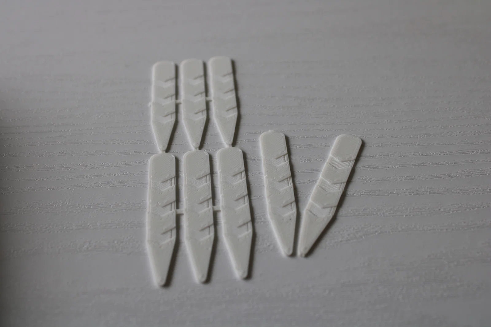 Mình hay bị thất lạc mấy cái nẹp cổ áo (collar stays) của áo sơ mi mỗi lần giặt đồ. May mà món này in rất đơn giản và nhanh! In 3D collar stays cũng giúp bạn tuỳ biến dễ dàng, ví dụ như hoạ tiết chevron mình thêm vào ở bản mình đã in. Mỗi file in sẽ cho ra 4 bộ collar stays, được in chung thành một tấm lưới (grid) các chi tiết. Bạn chỉ cần dùng kéo cắt rời từng cái ra; phần lưới cũng giúp gom gọn các collar stays còn lại cho tới khi bạn cần dùng.
