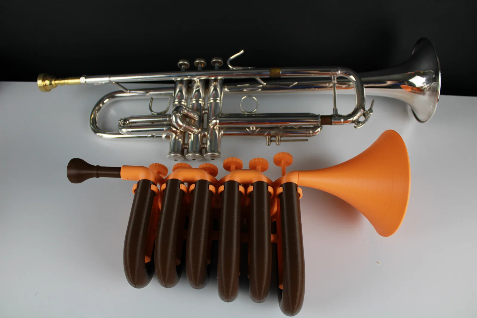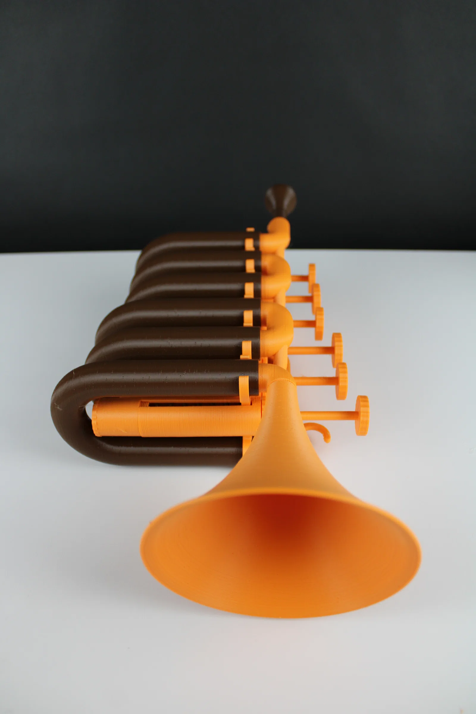 Dự án kèn trumpet in 3D hoàn toàn, dùng 6 valve dạng slide kiểu trombone để tăng chiều dài ống thay vì valve brass truyền thống. Có kèm STL/g-code, BOM lắp ráp và sẽ tiếp tục cập nhật bell, mouthpiece để cải thiện âm.