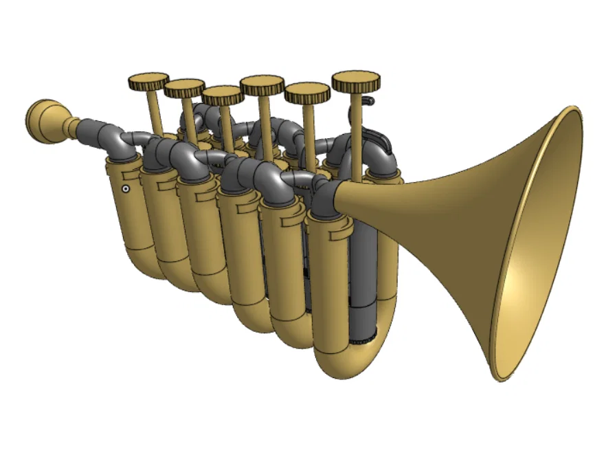 Mình thiết kế phiên bản “hơi quá phức tạp” của kèn trumpet này và toàn bộ đều 3D printed! Thông thường, valve của nhạc cụ brass hoạt động bằng cách chuyển hướng luồng khí qua các đoạn ống có chiều dài khác nhau để đổi cao độ, từ đó chơi được các nốt khác nhau. Thay vì làm vậy, mình quyết định dùng nhiều valve để kéo các slide (giống trombone) nhằm tăng chiều dài ống. Tổng cộng có 6 valve hoạt động, với các chiều dài như sau: