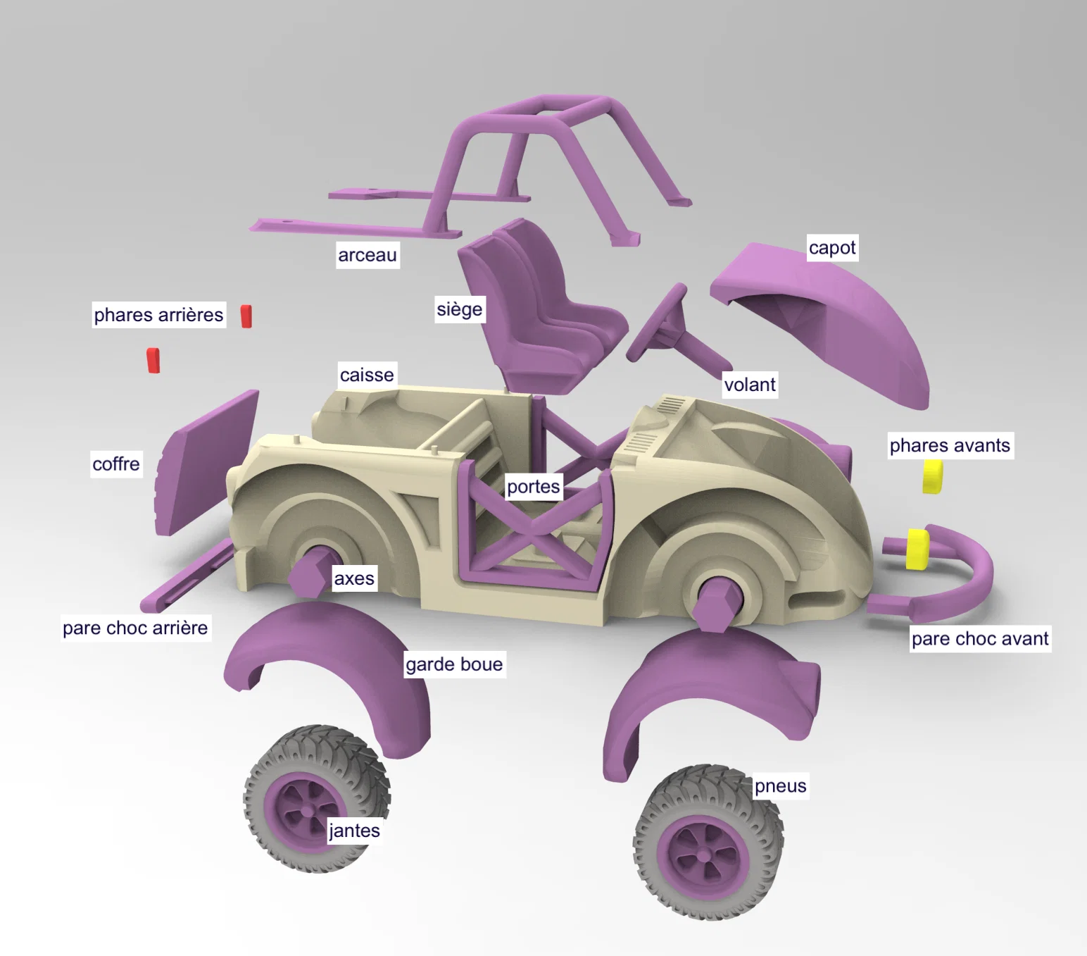 Car V5 là mẫu mô hình xe hơi để in 3D, kích thước 128 × 81 × 61 mm. Bạn có thể đổi orientation trong slicer. Gợi ý in: layer height 0,20, infill 17%, cần support cho caisse, garde boue, arceau.