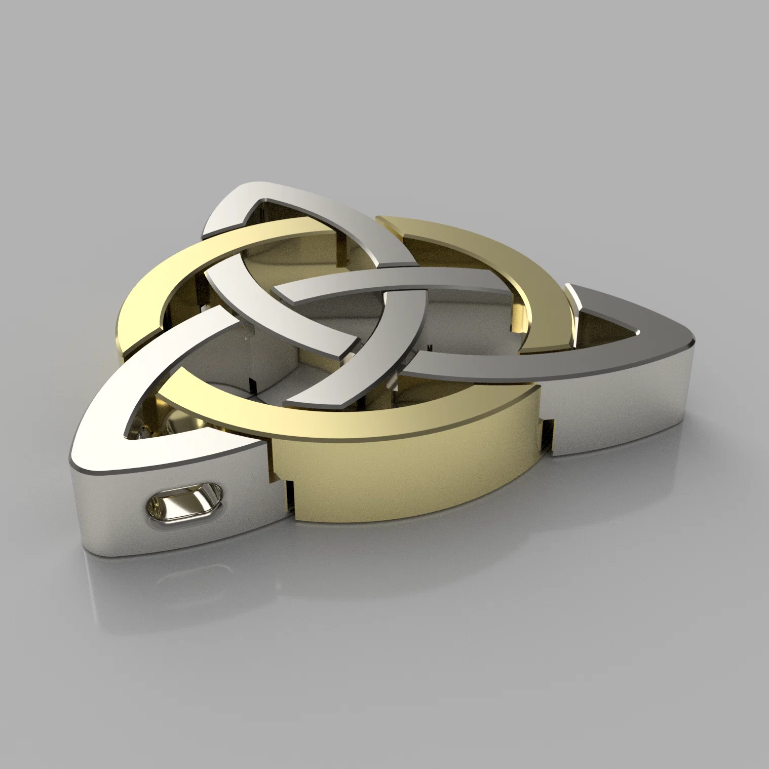 Mặt dây chuyền Celtic kim loại hai tông vàng–bạc với họa tiết nút thắt đan xen, tượng trưng cho vĩnh cửu và sự kết nối. Thiết kế tinh xảo, bền đẹp, dễ gắn dây, hợp đeo hằng ngày hoặc làm quà tặng.
