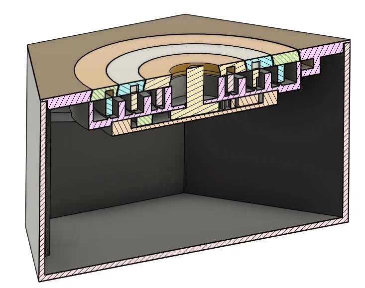 Mình muốn làm một cái puzzle box dùng các vòng đồng tâm từ lâu rồi, và cuối cùng cũng chốt được một thiết kế cho phép chủ nhân tự đổi mã số tùy ý. Ba vòng đồng tâm hiển thị lần lượt 8, 12 và 16 ký hiệu, tạo ra tổng cộng 1.536 tổ hợp. Khi canh đúng 3 ký hiệu đã chọn thẳng hàng với dấu mũi tên trên nắp, bạn có thể xoay núm trung tâm để mở khóa hộp.