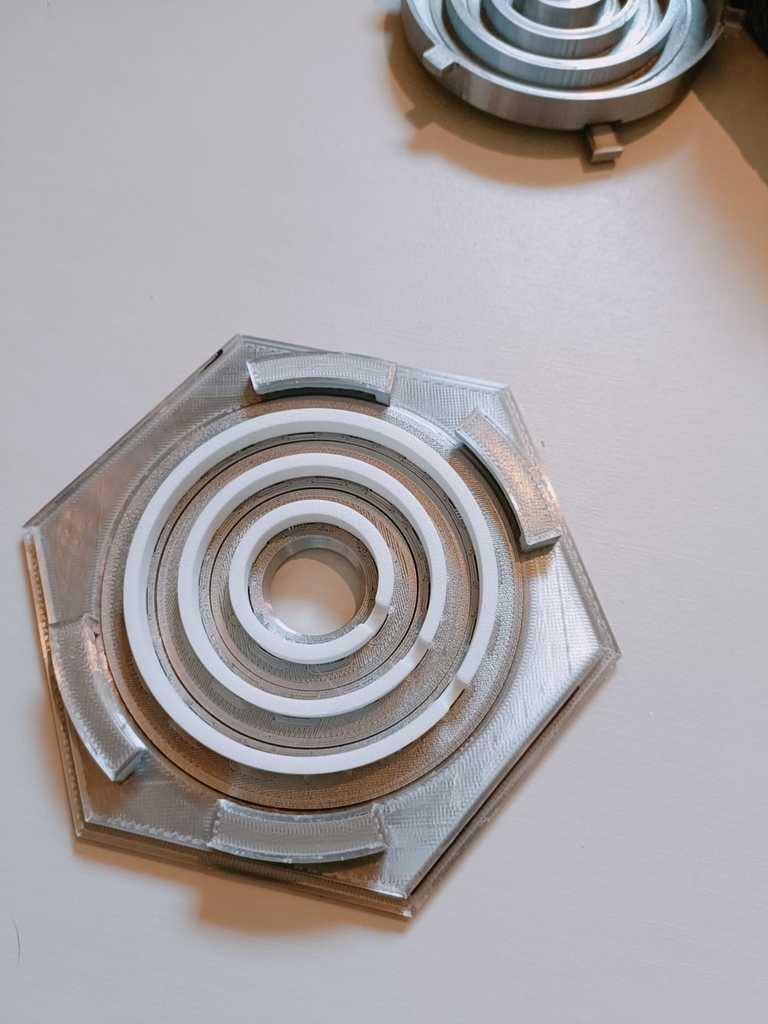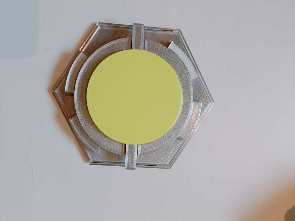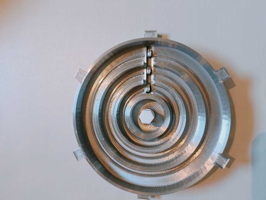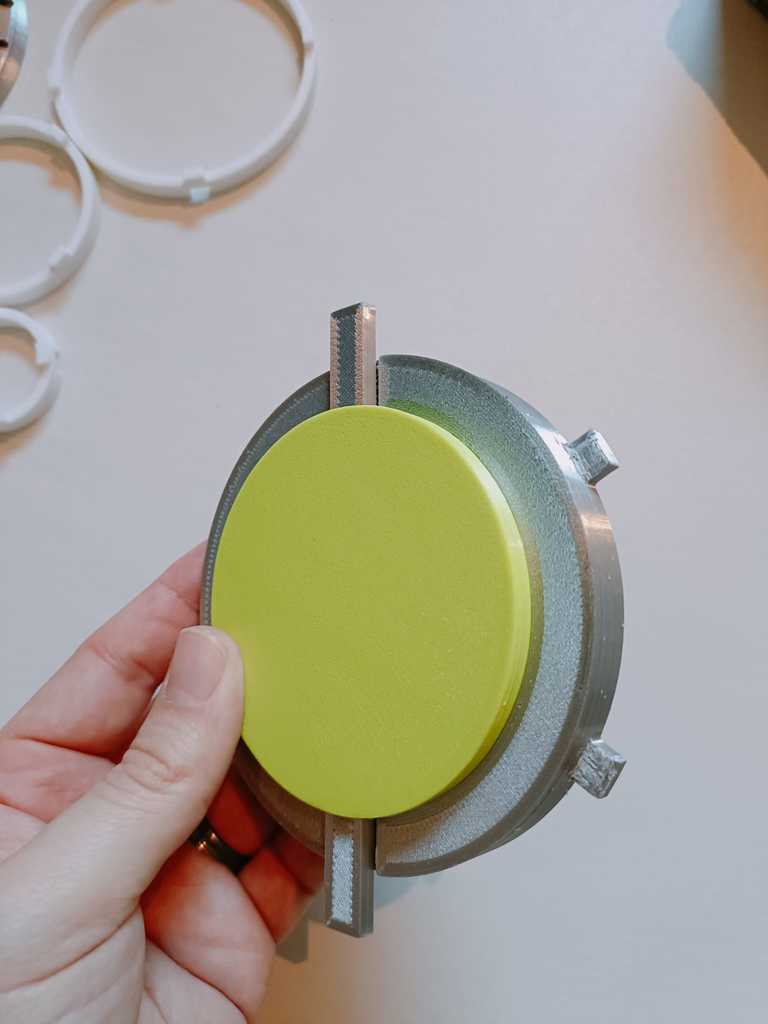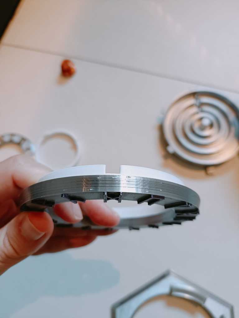 - Làm tương tự cho cả 3 vòng và xếp chúng vào trong Lid. Mỗi vòng sẽ giữ vòng nhỏ hơn kế tiếp, nhưng đừng nghiêng vì mọi thứ sẽ rớt ra hết. Giờ lấy cụm khóa (lock assembly) và nhẹ nhàng hạ xuống các encoder. Để lock đang ở trạng thái mở (unlocked) sẽ dễ hơn nhiều. Bước này hơi lắt léo và có thể cần thử vài lần lúc đầu. Khi encoder housing/lock assembly đã vào đúng vị trí, vặn để khóa nó vào Lid (xem ảnh). Chỗ này có thể rất khít và cần khít, nhưng nếu vặn hoài không vào, thử chà nhám các góc của mấy cái tab nhỏ trên encoder housing. Ngoài ra đôi khi vật liệu support còn sót trong các rãnh cũng làm kẹt.