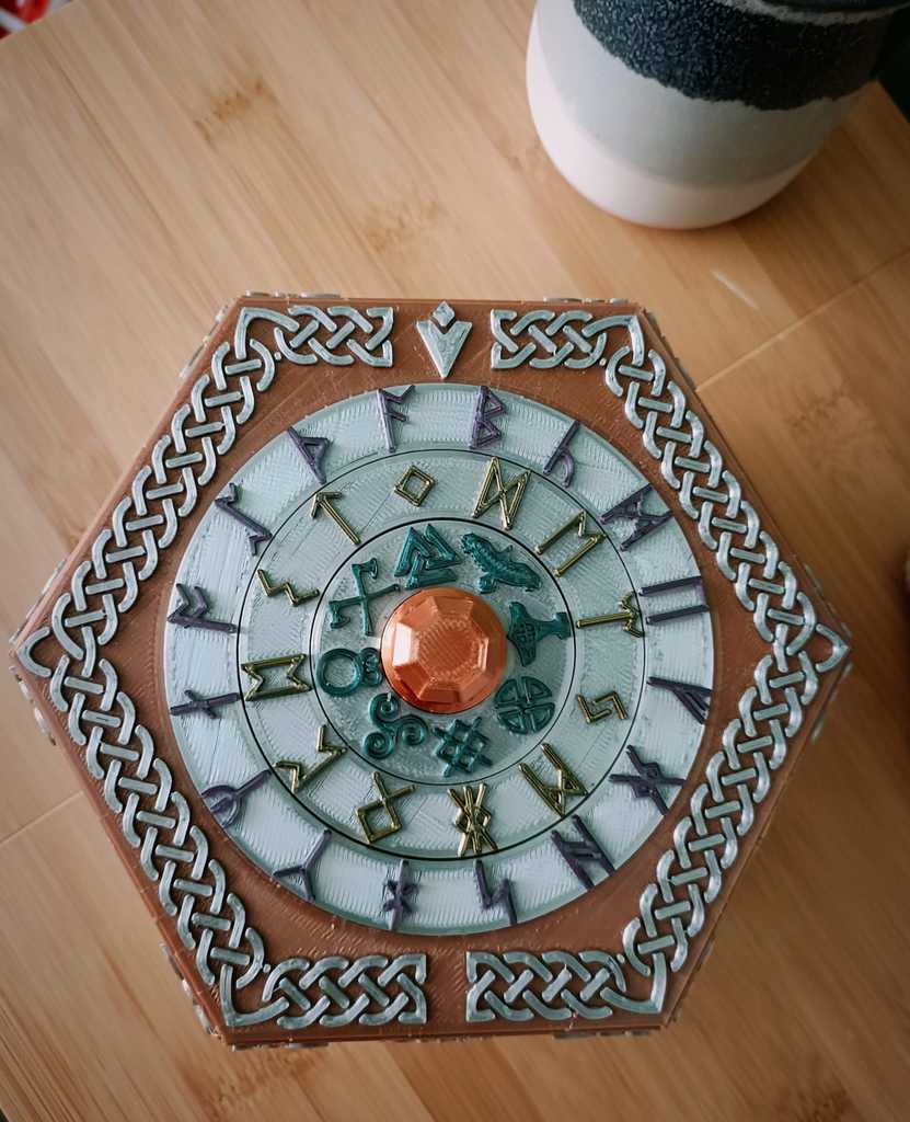 Hộp puzzle lock phong cách Viking với 3 vòng đồng tâm (8/12/16 ký hiệu), tổng 1.536 tổ hợp. Có thể tự reset đổi mã số, kèm panel/núm/bánh xe ký hiệu bản trơn để bạn tùy biến thiết kế và in nhiều màu bằng cách đổi filament.