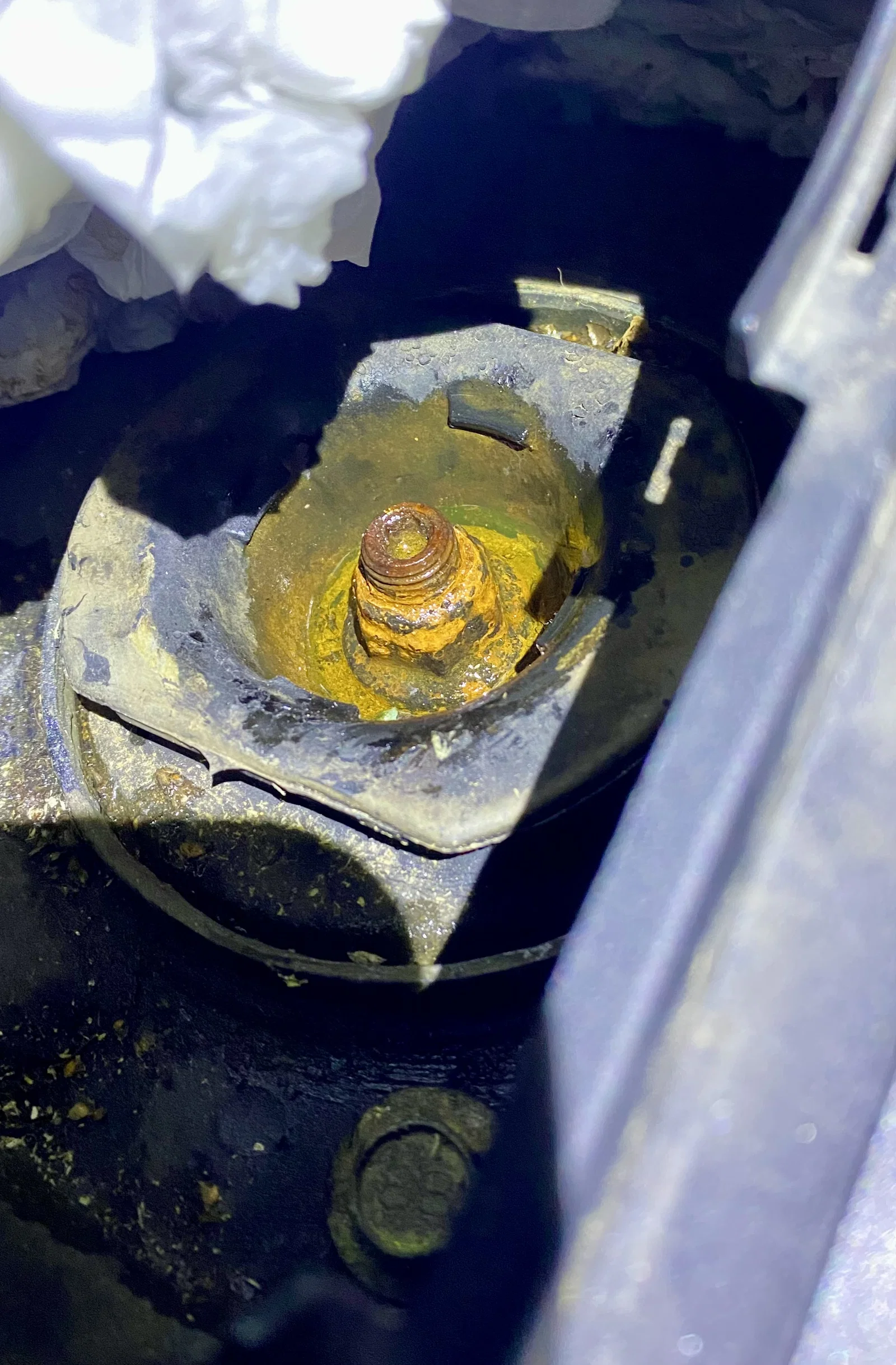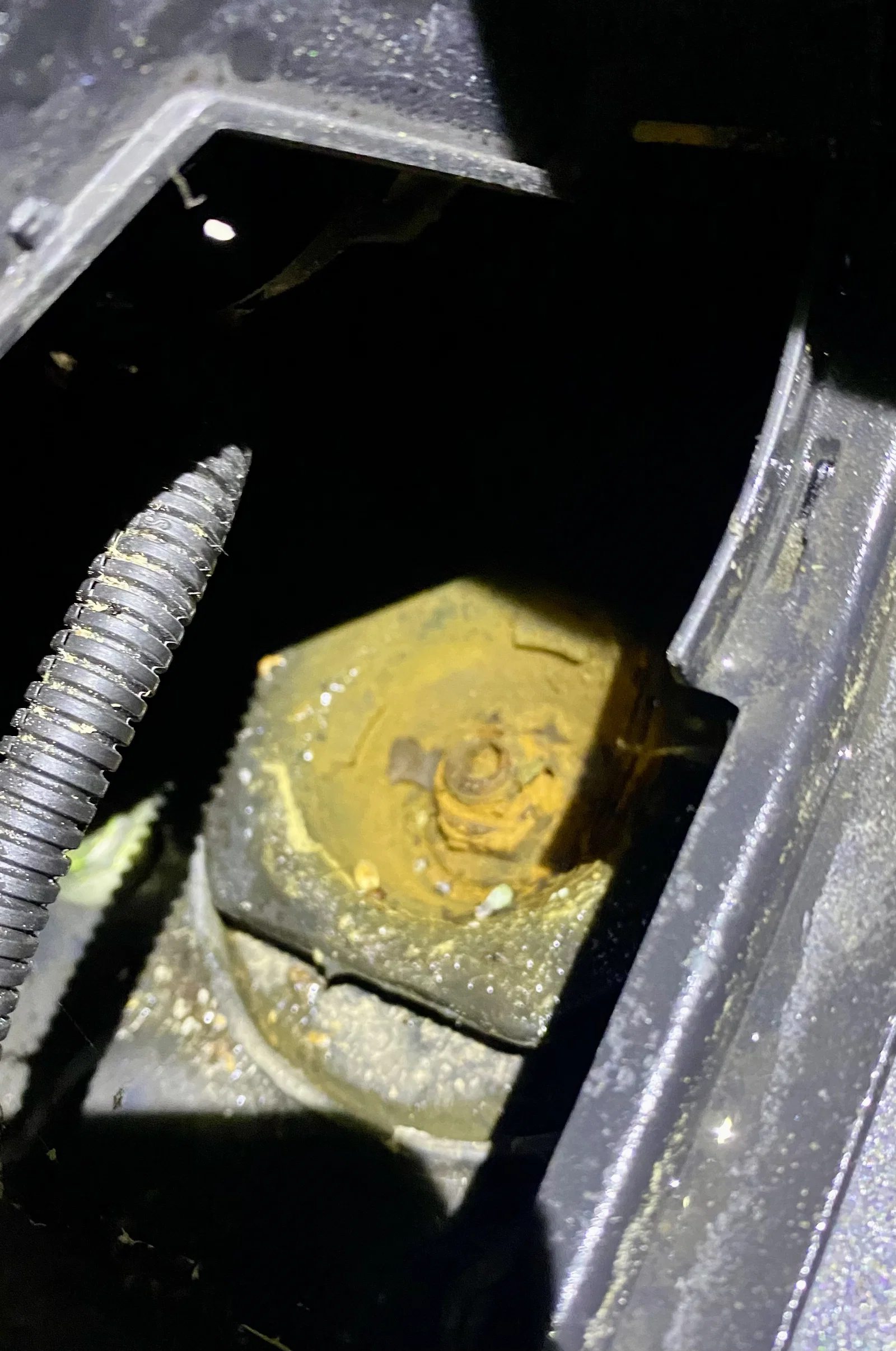 - Hình chụp cho thấy strut mount bị đầy nước trên Nissan Leaf 2019 (bản Châu Âu) khi không có nắp zin.