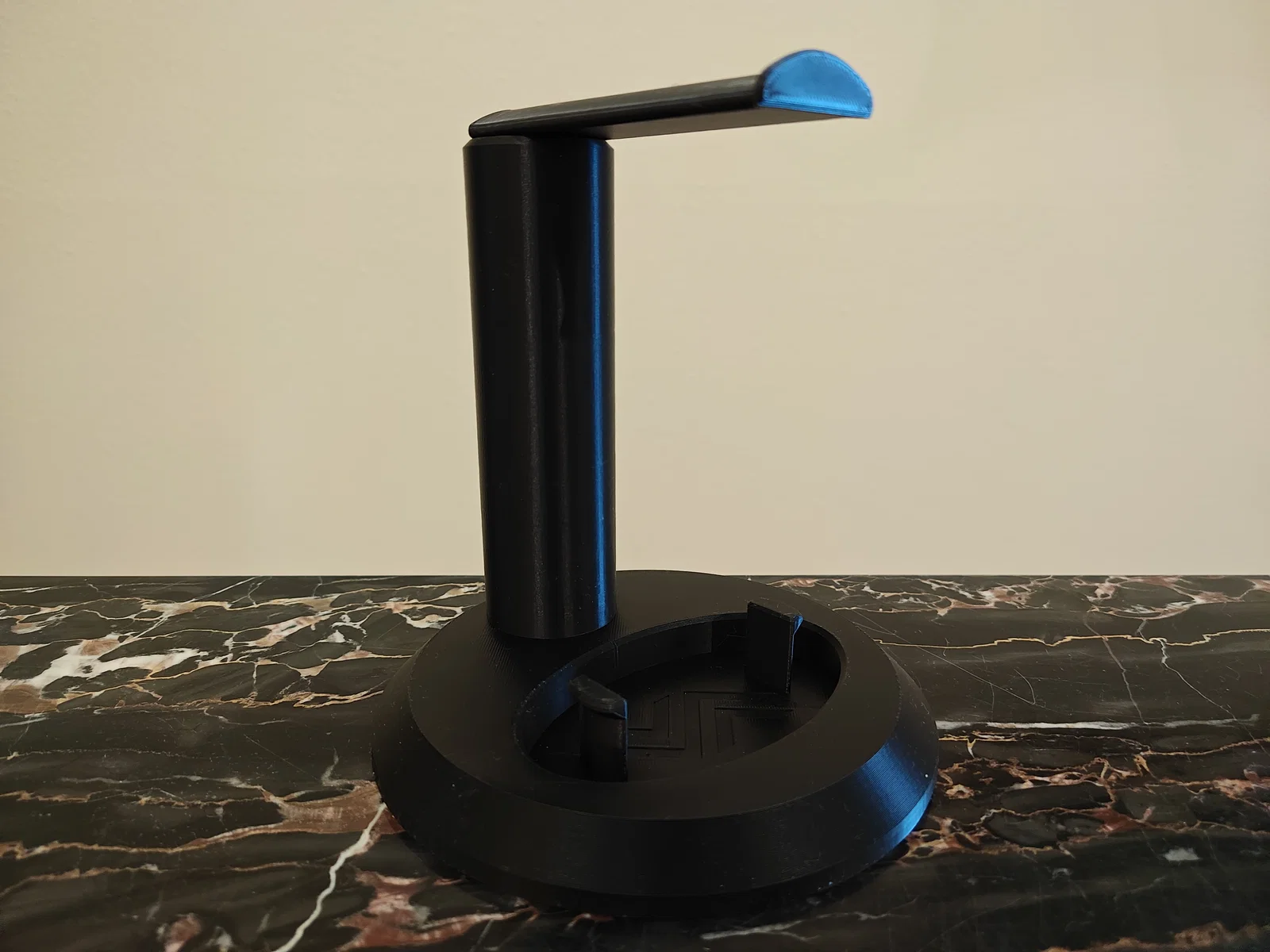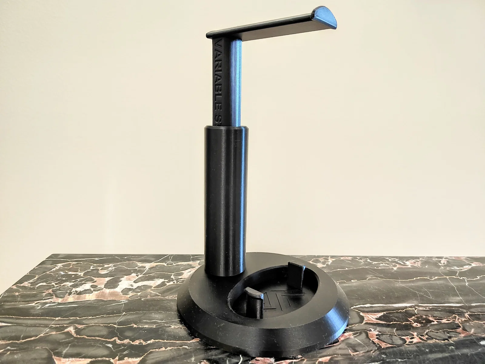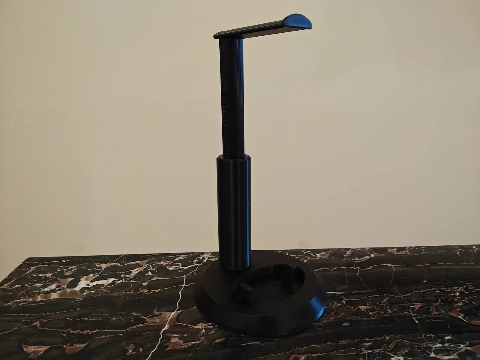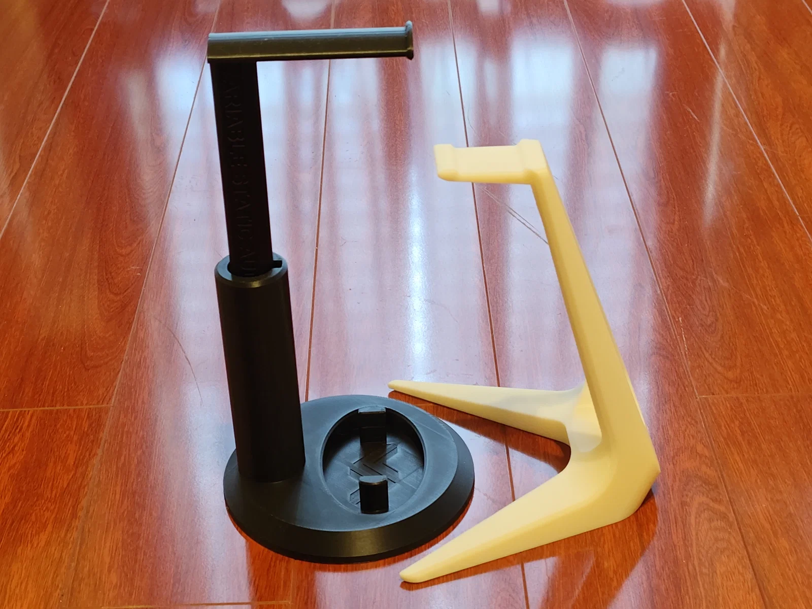 Một cái kệ để tai nghe có thể chỉnh chiều cao. Thiết kế vừa với khay in (build plate) của Bambu Lab A1 Mini.