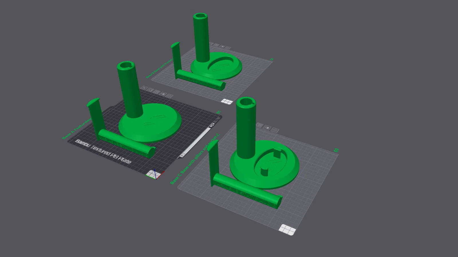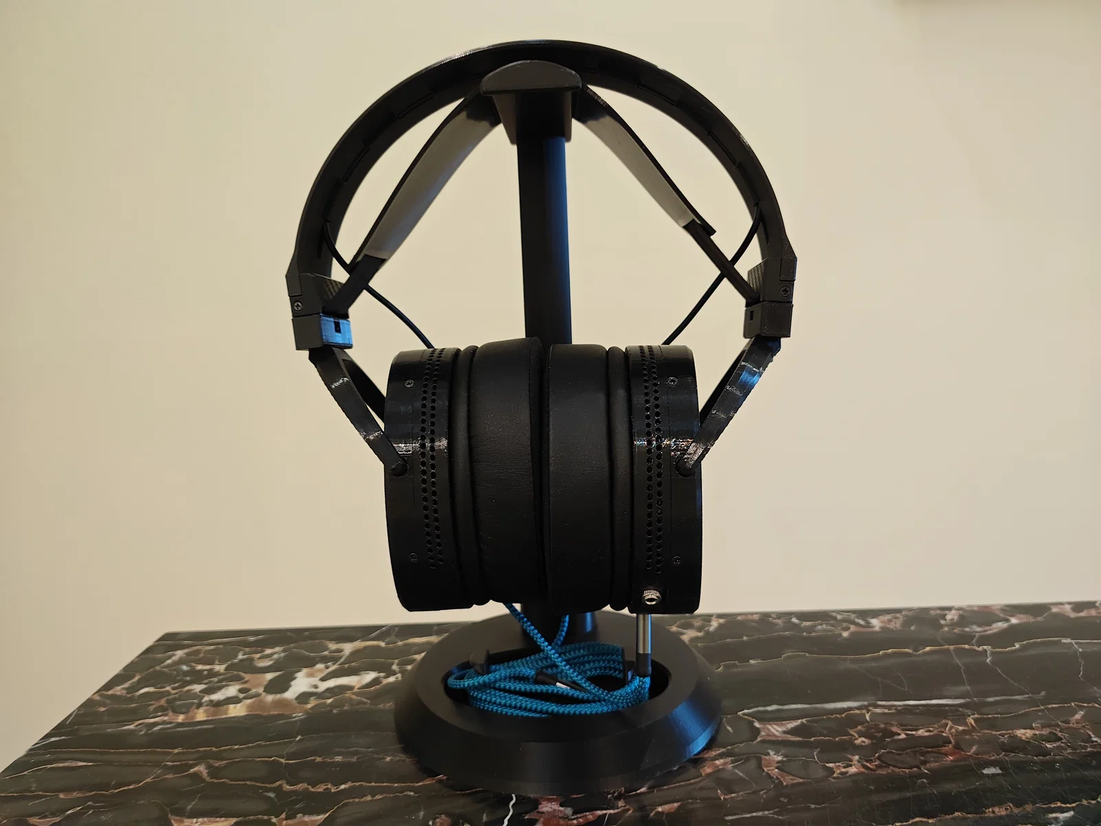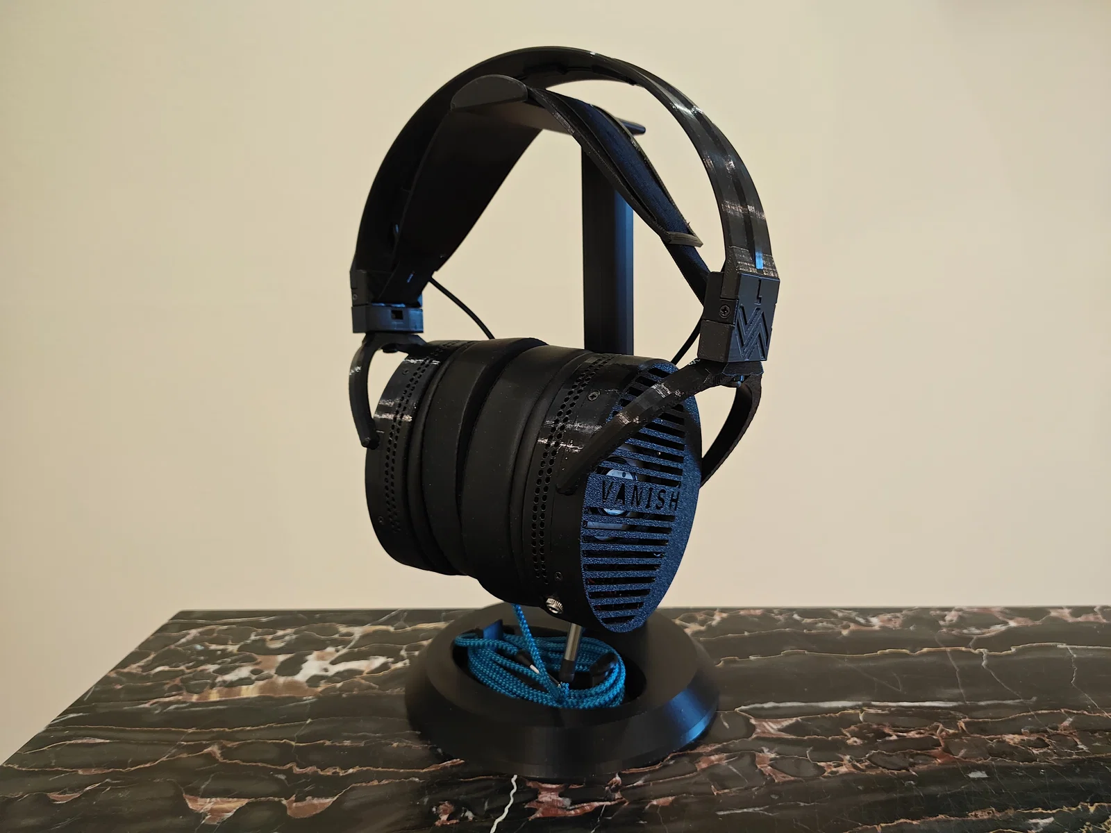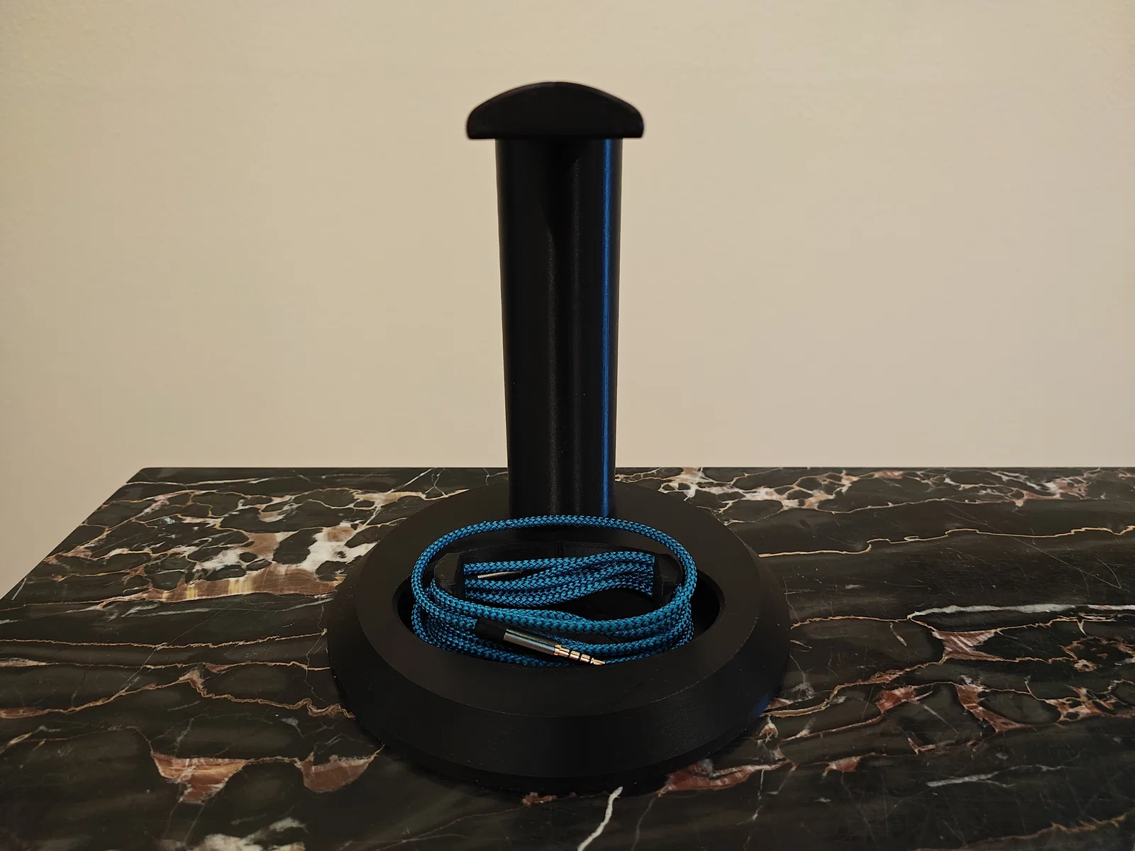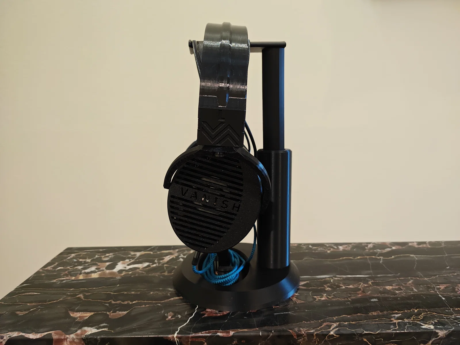 Một cái kệ để tai nghe có thể chỉnh chiều cao. Thiết kế vừa với khay in (build plate) của Bambu Lab A1 Mini.