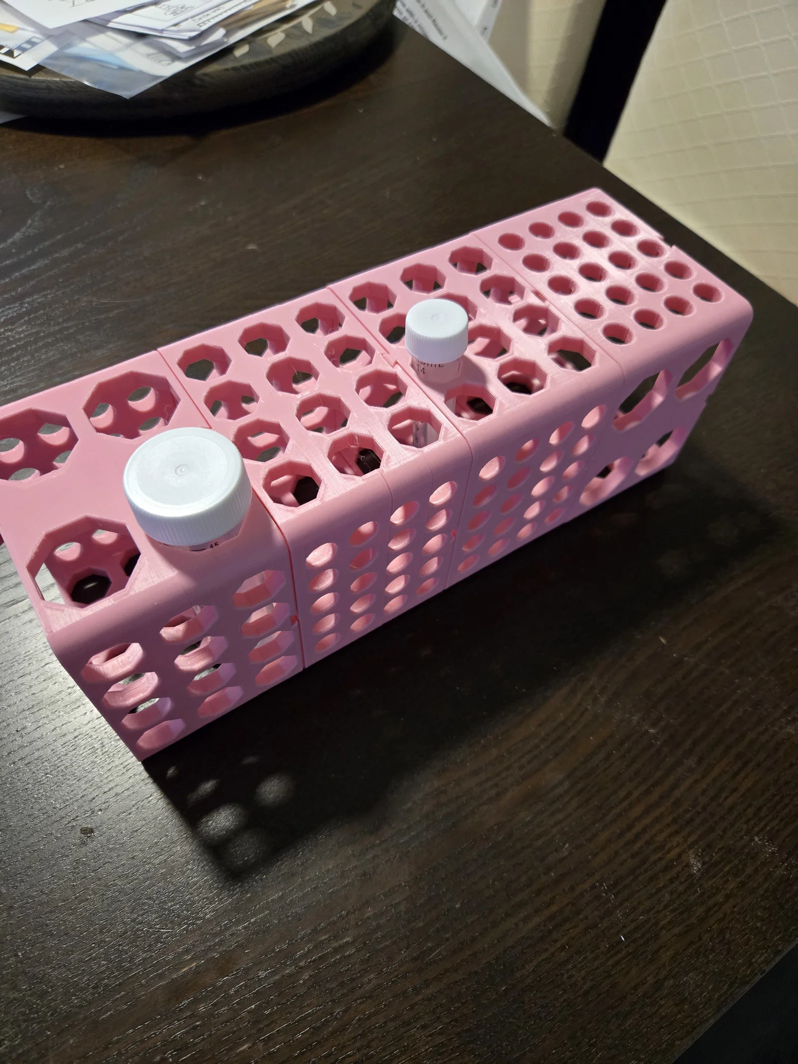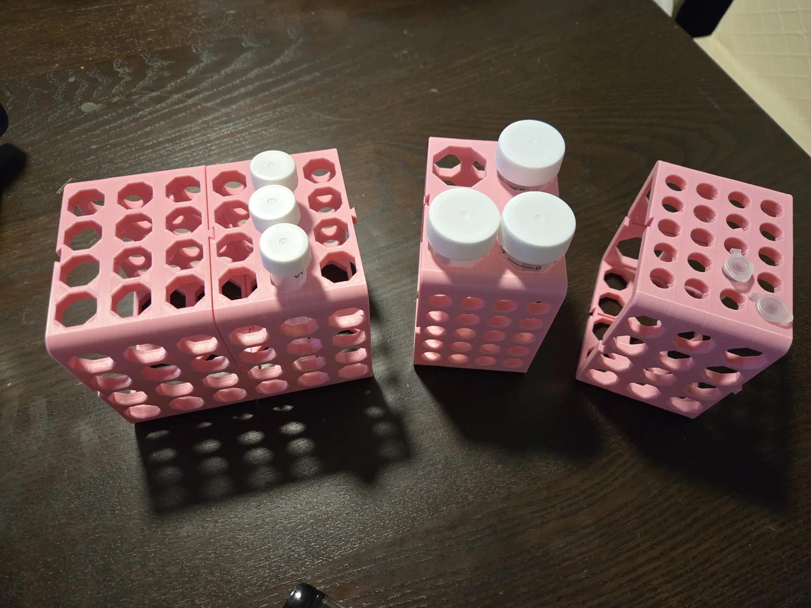 Đây là phiên bản cải tiến dựa trên . Tôi nhận thấy các lỗ tròn in khá khó và khoảng cách giữa các ống quá gần. Vì vậy, tôi đã đổi các lỗ lớn sang dạng hình bát giác để có thể in ổn định mà không cần support. Tôi cũng đã tải lên tệp F3D để mọi người có thể tự do thay đổi kích thước lỗ, số lượng ống tùy theo nhu cầu. Các tệp .3mf đã tải lên bao gồm hai mặt dành cho ống Falcon 15ml, một mặt cho ống 50ml và mặt còn lại dành cho ống microfuge 1.5ml. Trên đỉnh và đáy có các rãnh khớp nối để bạn có thể ráp chúng lại với nhau thành các giá đỡ lớn tùy ý. Tôi thấy rằng nếu cạo nhẹ phần mặt dưới của các rãnh khớp bằng dao đa năng thì các mảnh sẽ khớp với nhau hoàn hảo hơn, nhưng tùy vào độ tinh chỉnh của máy in mà bước này có thể không cần thiết. Trong cả tệp .F3D và tệp .3mf riêng biệt, tôi có kèm theo một giá đỡ (shelf) có thể lắp vào để nâng cao các ống 15ml và 50ml. Đây là phần tùy chọn, không bắt buộc để giữ độ chắc chắn cho mô hình, chỉ là để tiện dụng hơn vì nếu không có nó, các ống này dễ bị trượt xuống quá sâu hoặc rơi qua lỗ ở phía đối diện của giá.
