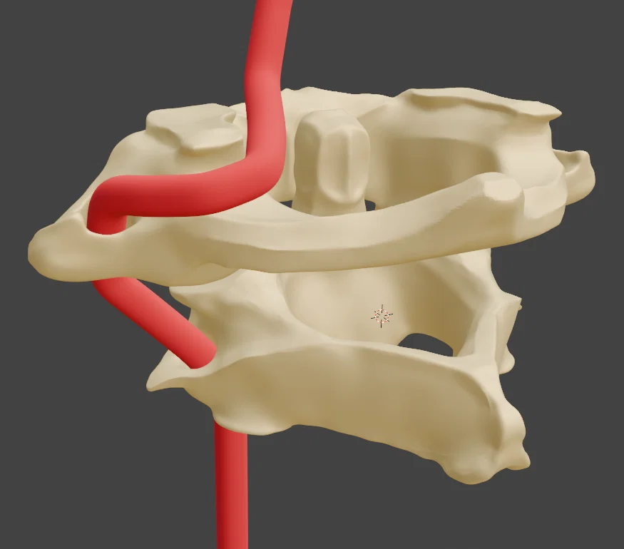 Mẫu giải phẫu hai đốt sống cổ đầu tiên Atlas và Axis (C1, C2), kèm động mạch đốt sống. Model được sculpt trong Blender dựa trên tài liệu tham khảo từ Gray's Anatomy và Netter's Anatomy.