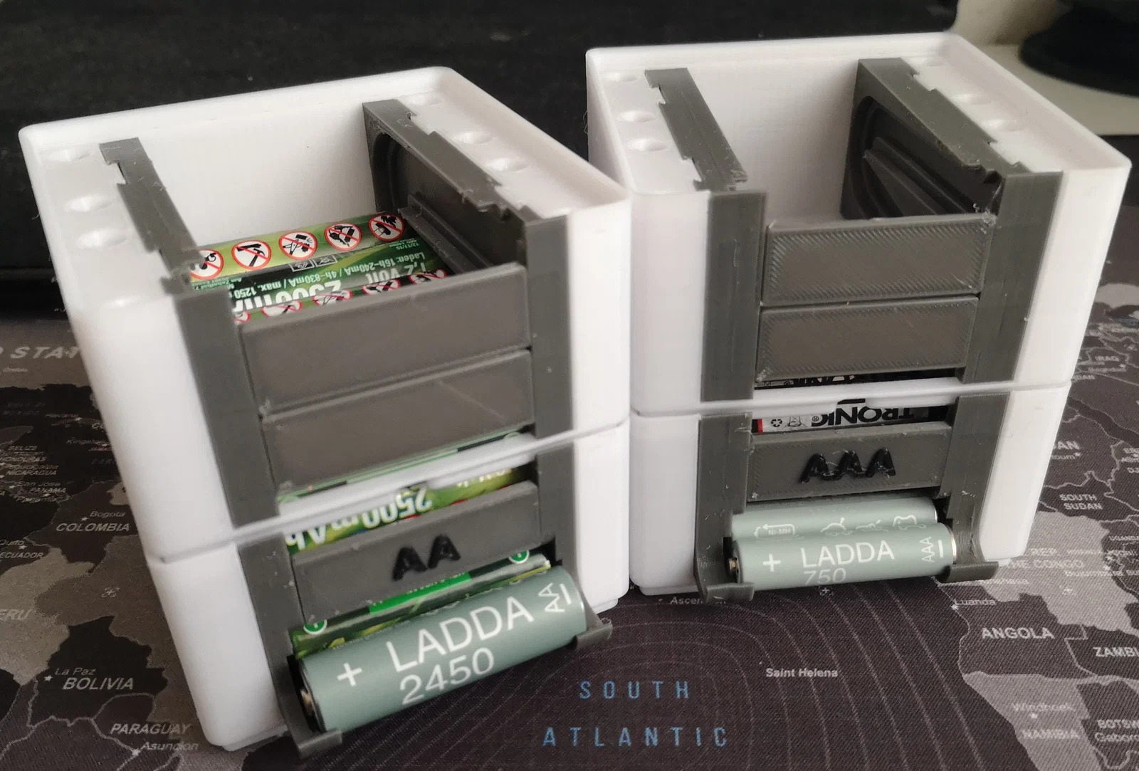 Đây là bản Remix của mẫu stackable battery dispenser. Mình rất thích ý tưởng của thiết kế gốc, nhưng nó lại không vừa pin sạc IKEA LADDA của mình.
