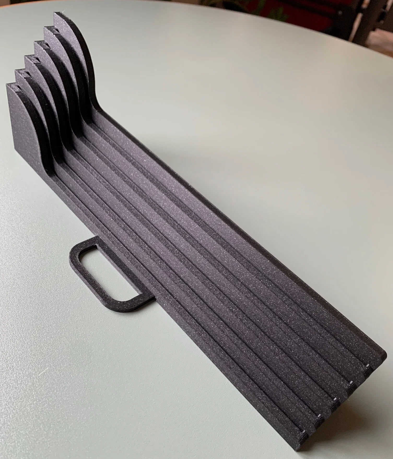 Giá đựng steel sheet dạng stand-alone, chứa tối đa 5 tấm. Có thể đọc tên từng tấm để chọn nhanh, có chặn chống trượt tuột. Thiết kế gọn bàn, tiết kiệm filament; kích thước 265×90×276 mm.