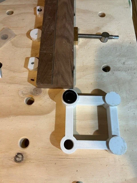 Jig khoan giúp canh chuẩn khoảng cách dog hole 96mm (on center) cho bàn MFT/Festool style. Dùng drill bushing Lee Valley để mũi khoan không mài nhựa in 3D, giữ độ chính xác bền lâu; kèm dogs để định vị.