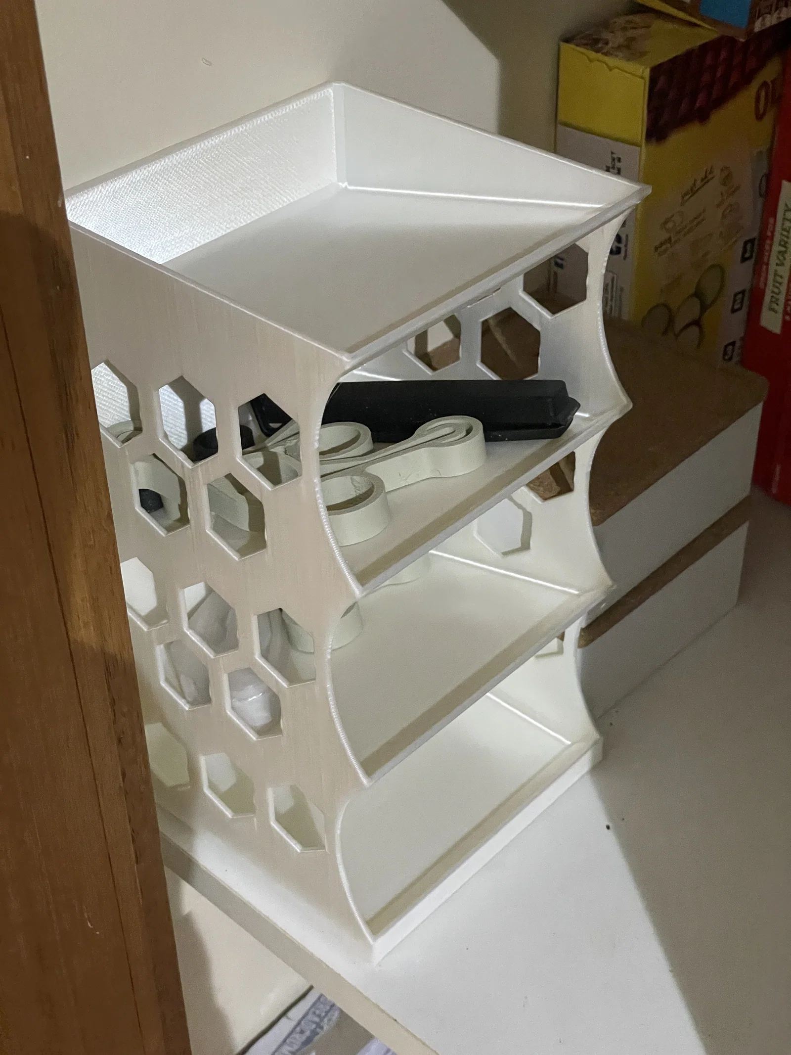 Sản phẩm này đặc biệt hữu ích khi bạn cần phân loại nhanh các món đồ hay dùng mà không muốn chúng bị thất lạc. Việc thiết kế các vách ngăn dạng tổ ong không chỉ tạo vẻ đẹp hiện đại, bắt mắt mà còn giúp giảm bớt lượng vật liệu in, giúp kệ nhẹ hơn nhưng vẫn đảm bảo độ cứng cáp cần thiết. Bạn có thể dễ dàng đặt kệ trên bàn làm việc, kệ sách hoặc bên trong ngăn kéo tủ để tận dụng tối đa không gian trống. Đây chắc chắn là món phụ kiện mà bất kỳ ai yêu thích sự ngăn nắp, khoa học đều nên có.