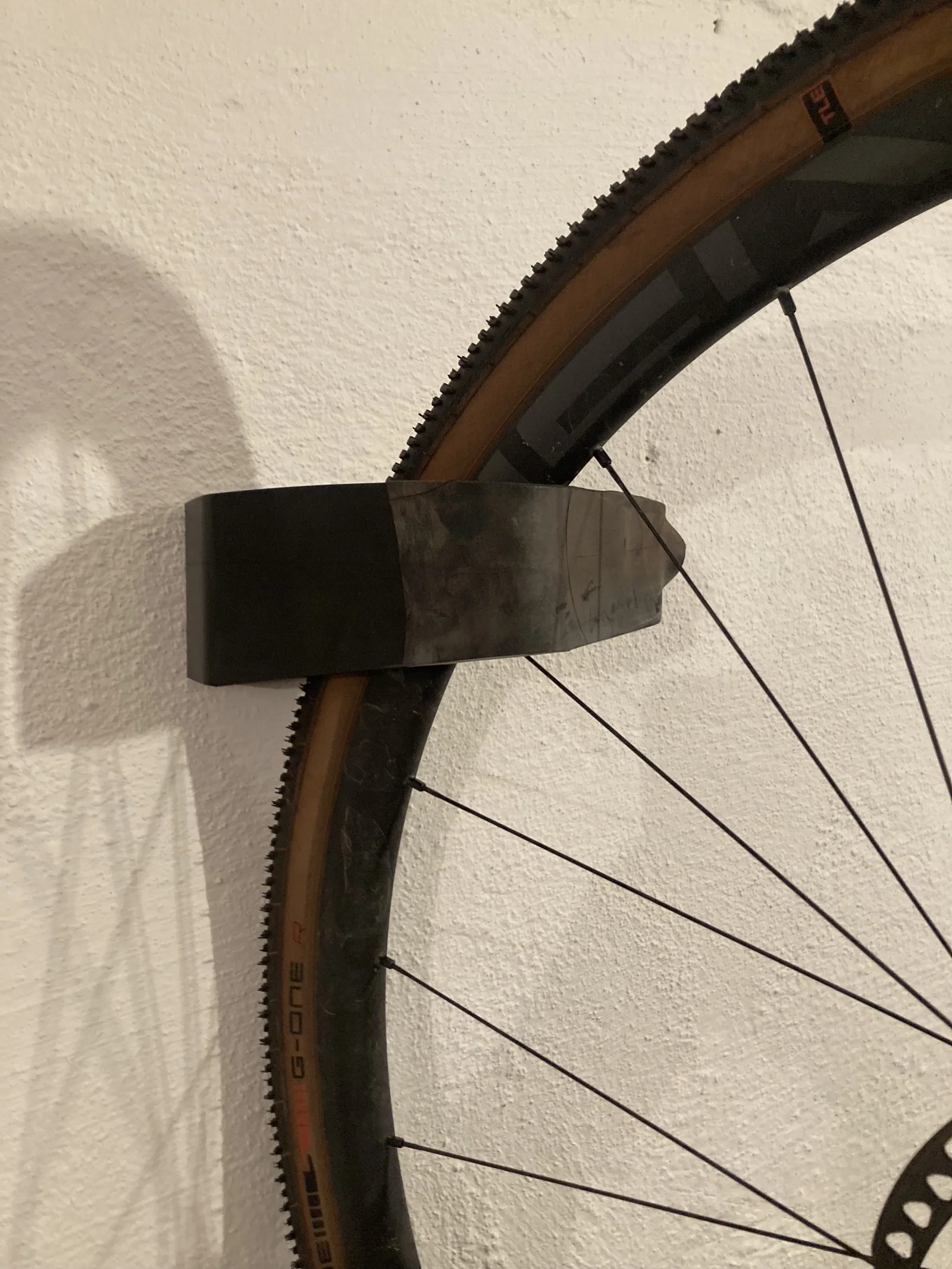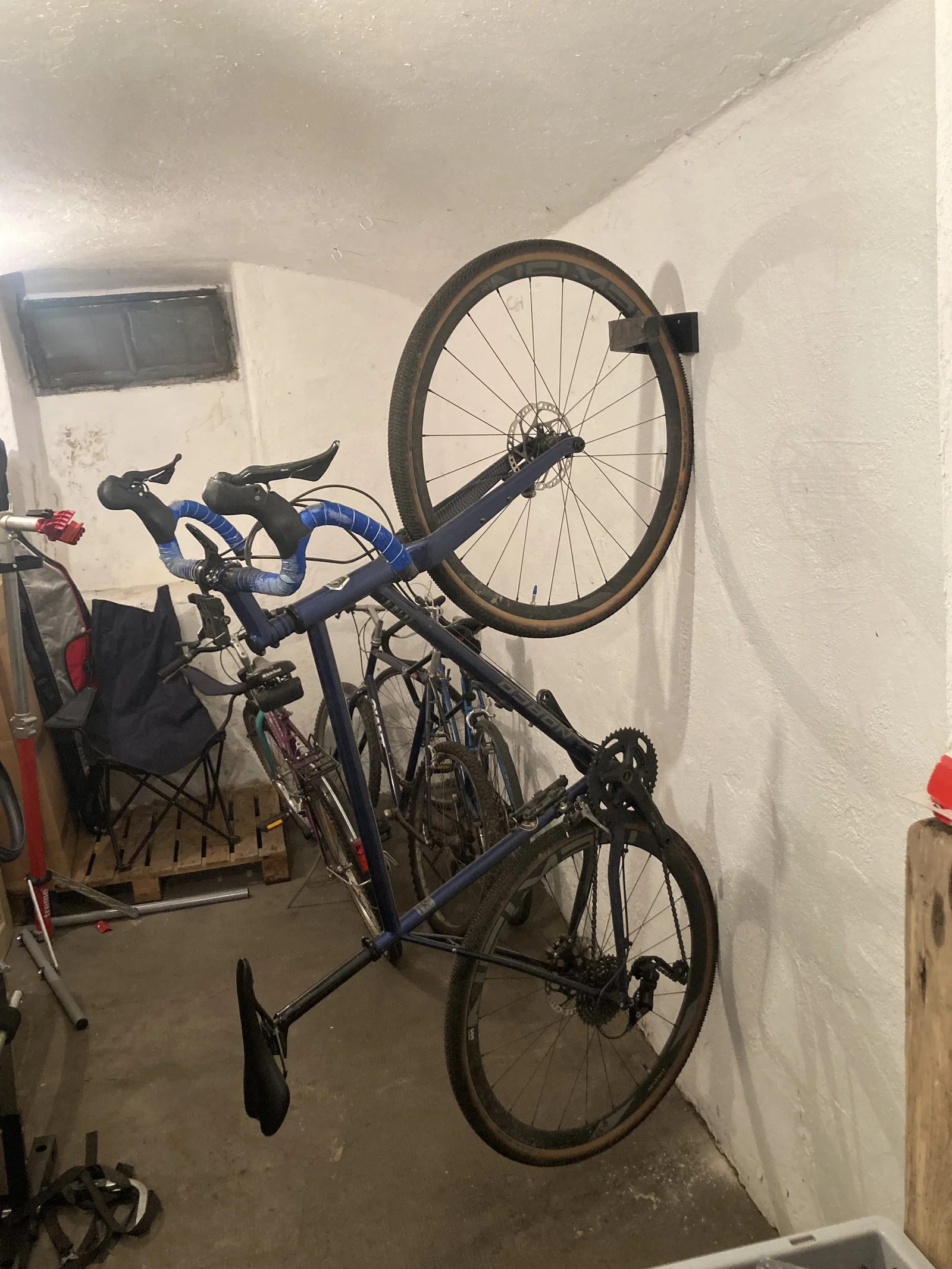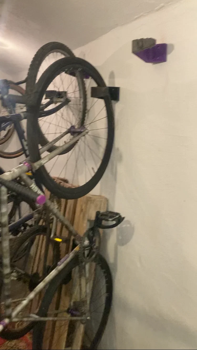 Móc này được đặt nghiêng 60 độ so với tường, nên có thể treo được nhiều xe hơn trong một diện tích nhỏ. Bọn mình có thể cất khoảng 10 chiếc xe trên một mảng tường dài tầm 4 mét.