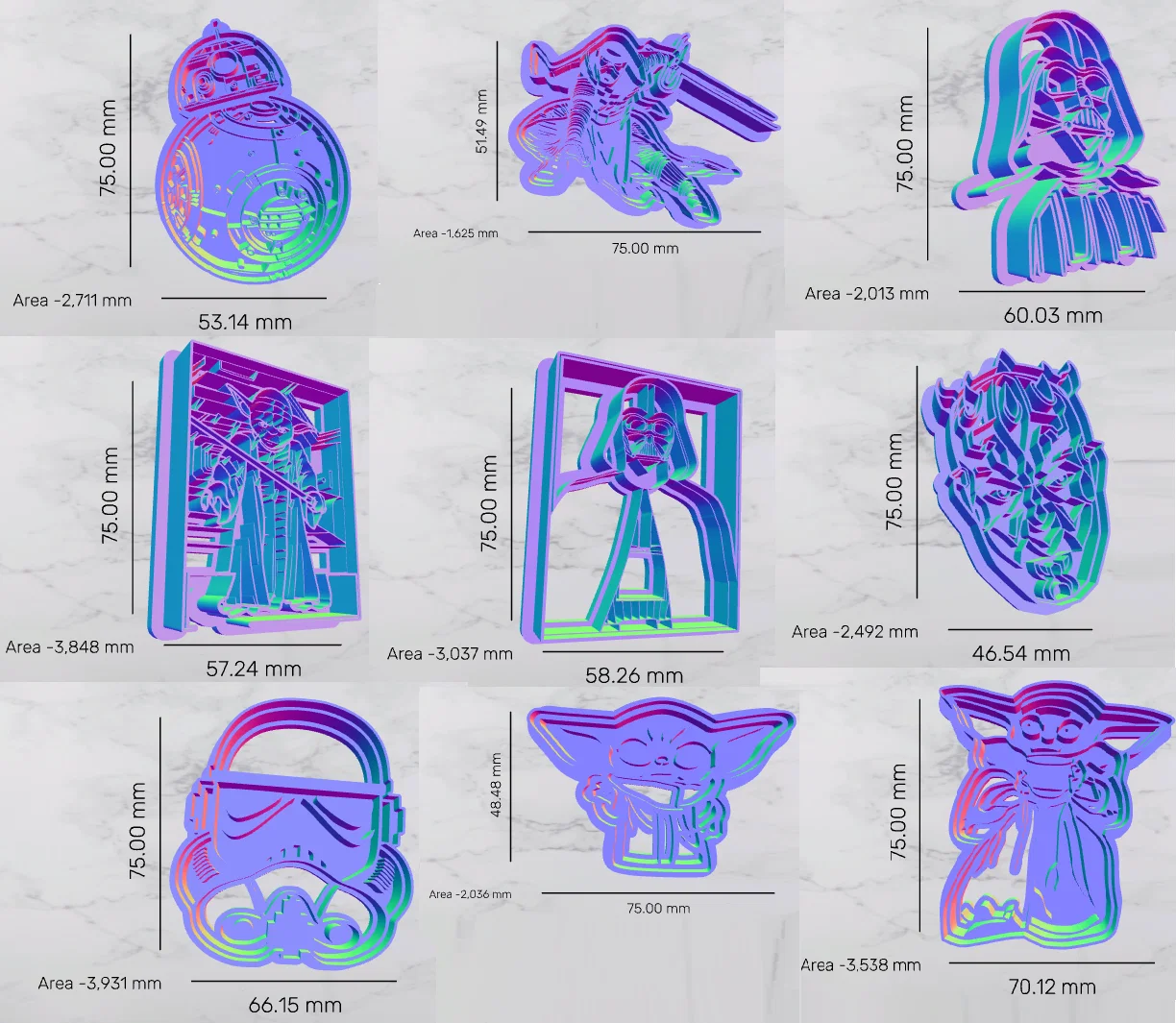 Mang cả vũ trụ Star Wars vào gian bếp của bạn với bộ khuôn cắt bánh quy in 3D vô cùng ấn tượng. Từ những nhân vật phản diện kinh điển như Darth Vader, Darth Maul cho đến các anh hùng đáng yêu như Yoda, Grogu và những robot thông minh như R2-D2 hay BB-8, bộ sản phẩm này cho phép bạn tạo ra những chiếc bánh quy theo phong cách thiên hà cực kỳ bắt mắt. Sản phẩm được thiết kế tinh xảo với kích thước tối ưu, giúp bạn dễ dàng làm ra những chiếc bánh hoàn hảo cho mọi buổi tiệc. Đây chính là phụ kiện không thể thiếu dành cho các fan Star Wars yêu thích nấu nướng và sáng tạo, mang lại trải nghiệm làm bánh thú vị và đầy cảm hứng ngay tại nhà.