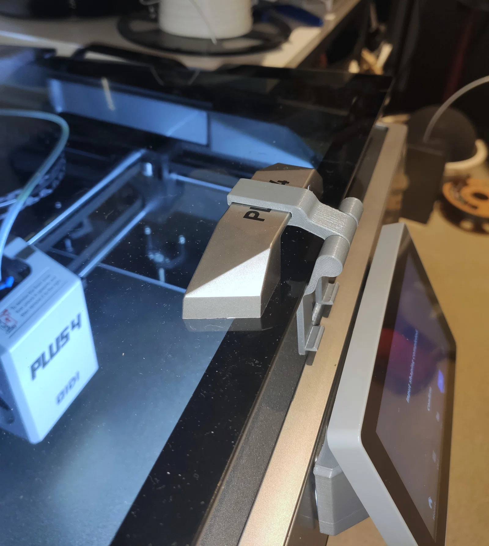 Phụ kiện giá đỡ nhỏ gọn có bản lề dành cho tấm kính phía trên của máy in Qidi plus 4. Thiết kế tiện lợi, dễ dàng gắn vào tay cầm, nên sử dụng nhựa PETG để in để đảm bảo độ bền tối ưu cho sản phẩm.