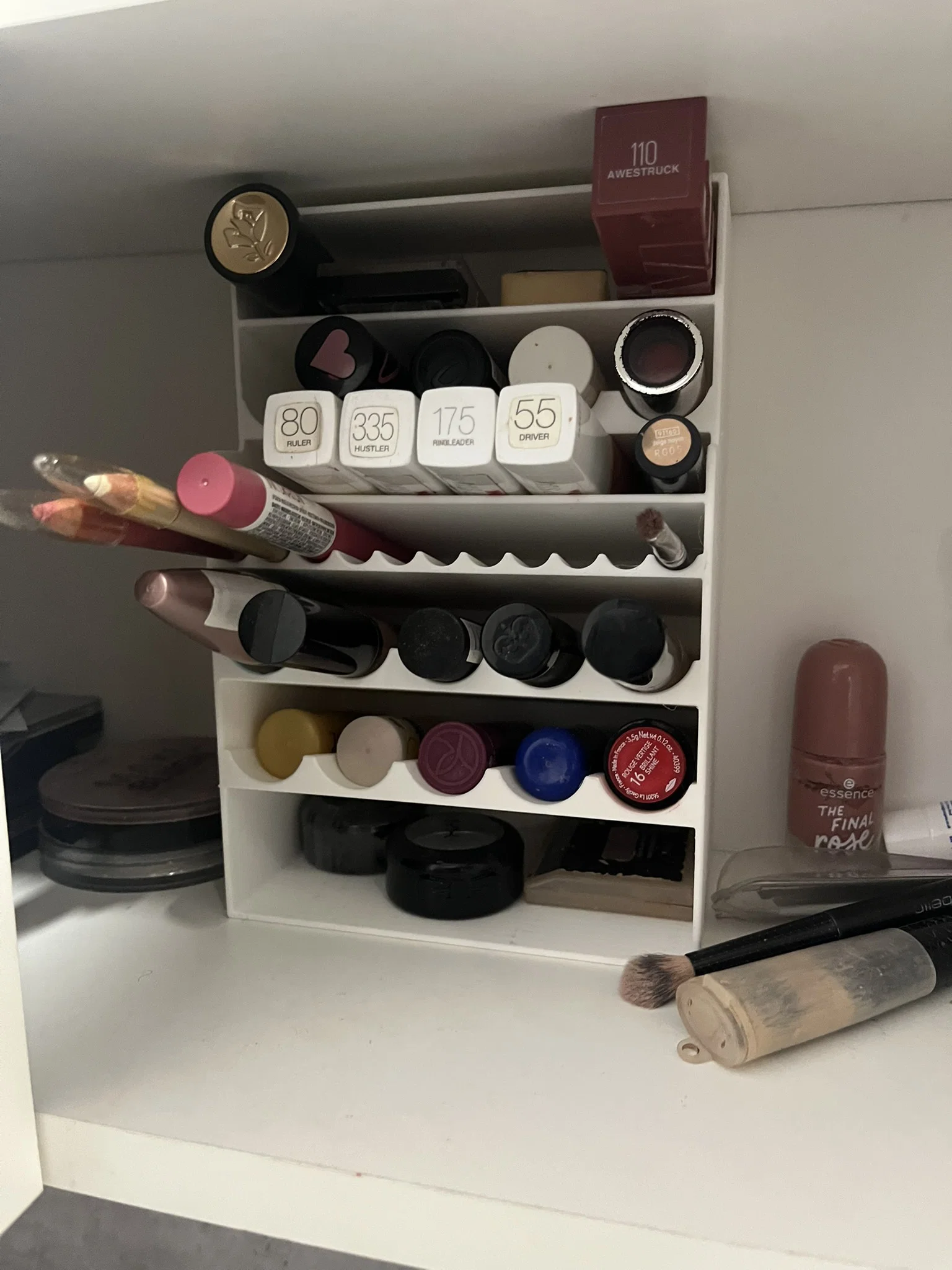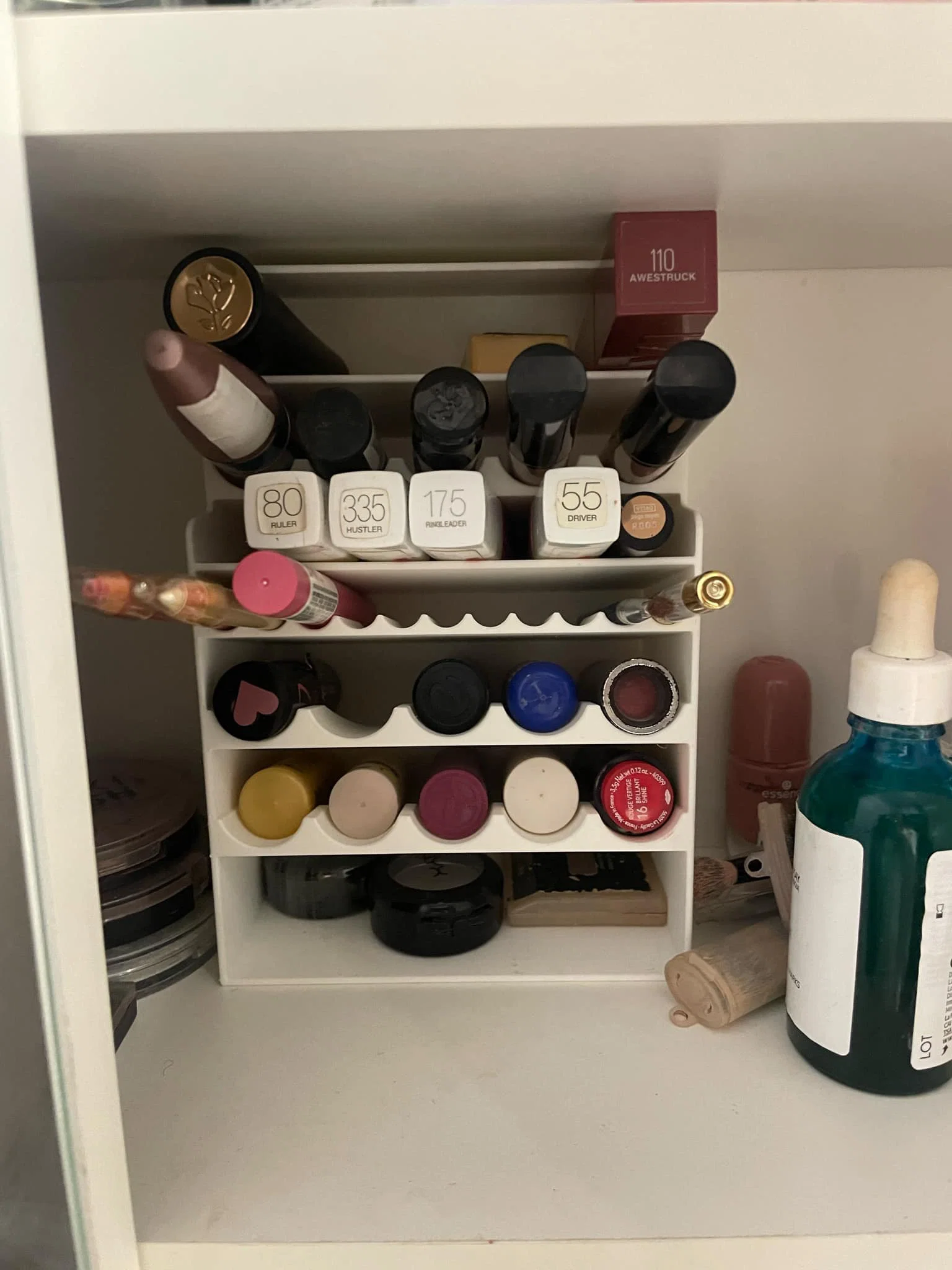 - Đa năng: Không chỉ đựng son, kệ còn dùng được cho bút kẻ mắt, mascara, cọ trang điểm hay thậm chí là một số loại tinh chất dưỡng da cỡ nhỏ.