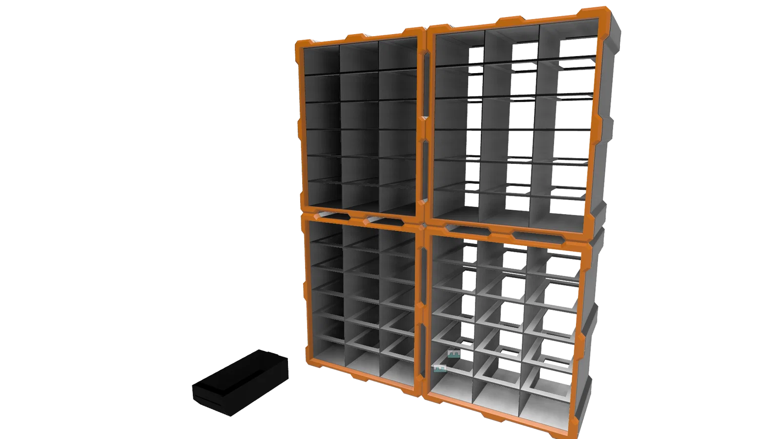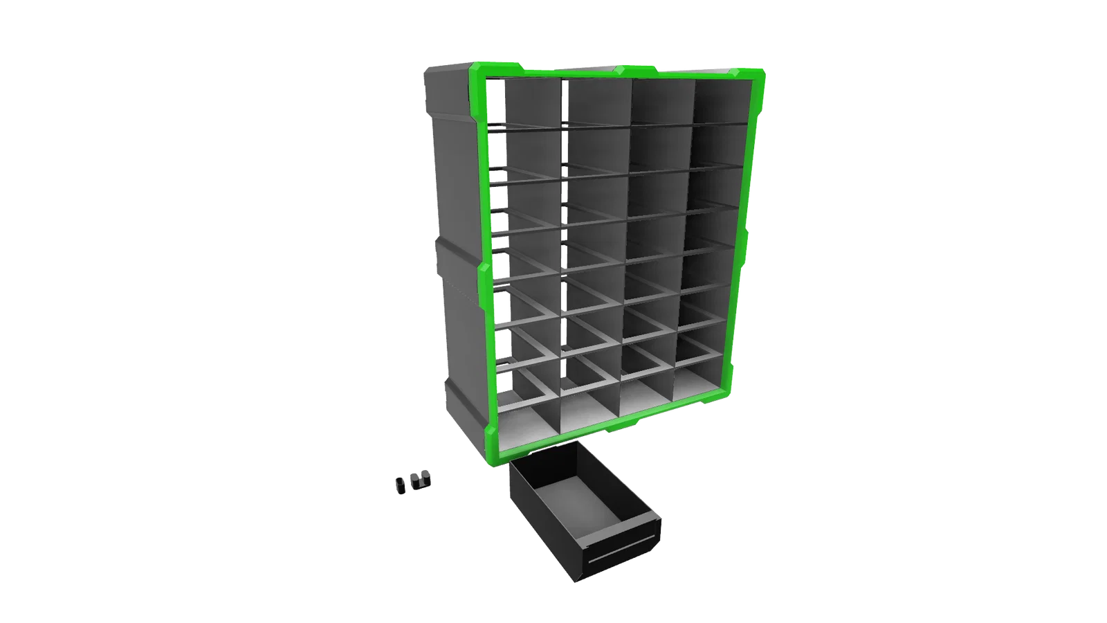 Bộ Small Parts Organizers có nhiều biến thể: loại xếp chồng (stackable) hoặc treo (hanging). Có các kích thước 300x350mm và 200x240mm với nhiều cấu hình ngăn kéo. Nếu cần thì dùng supports khi in.