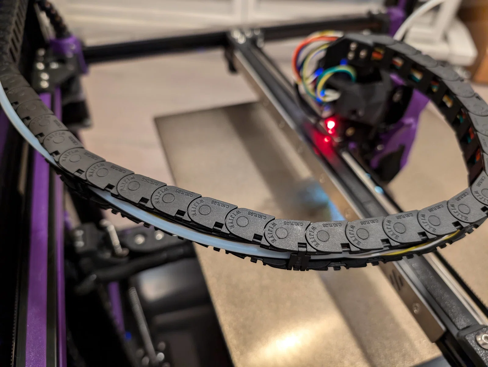 Trên con Trident 350 của mình, mình để 10 mắt xích giữa điểm cố định phía sau và giá đỡ ở tâm. 28 mắt còn lại cho phép đầu in chạy thoải mái khắp bàn in mà không làm căng dây hay ống PTFE.