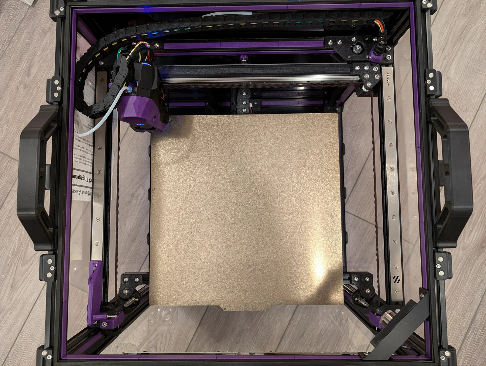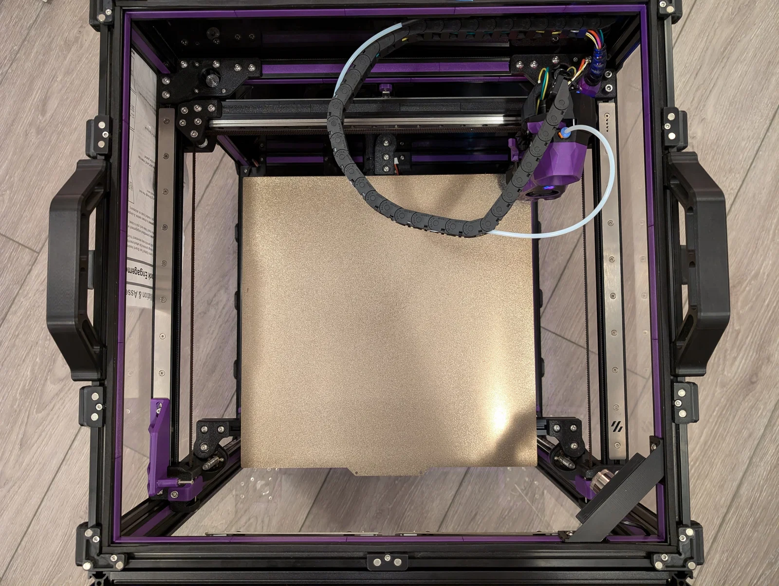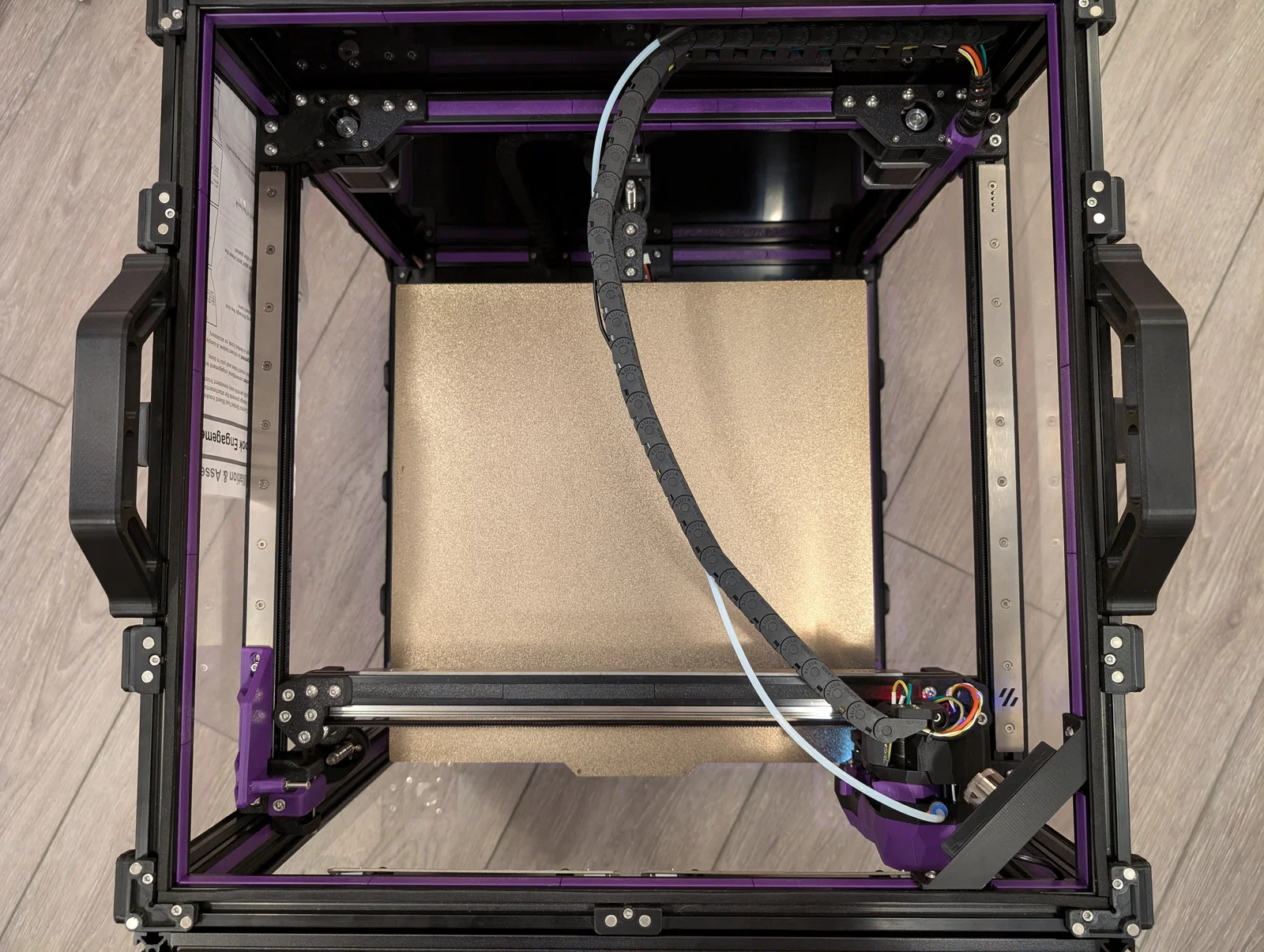 Xích có thể chạm vào tấm panel bên trái khi đầu in di chuyển về góc sau bên trái, dễ gây trầy panel. Tạm thời mình chèn một mảnh giấy giữa panel và khung để bảo vệ.