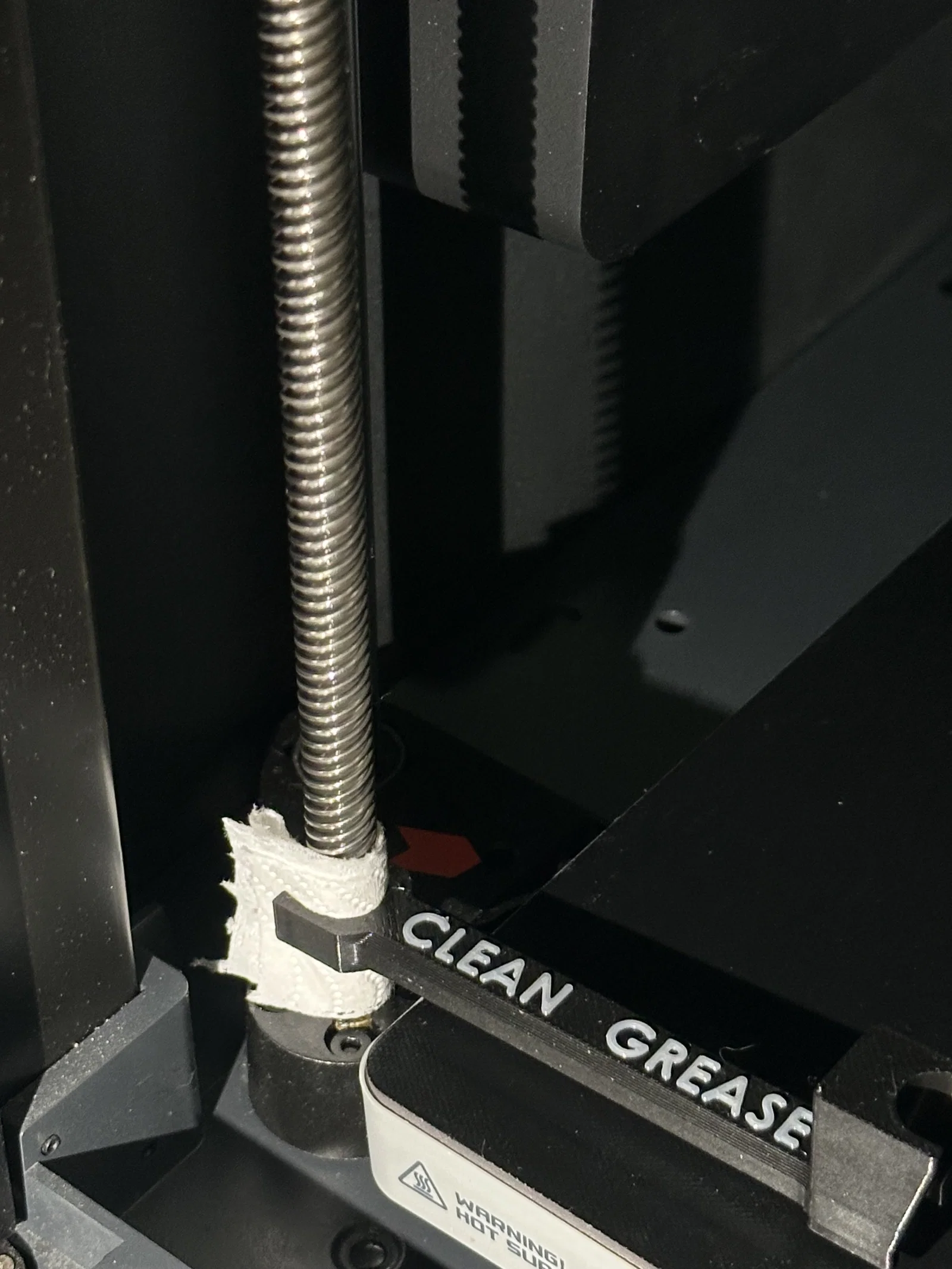 - Sau đó canh cho mặt GREASE thẳng hàng với lead screw và giữ dụng cụ tì xuống heat bed.
