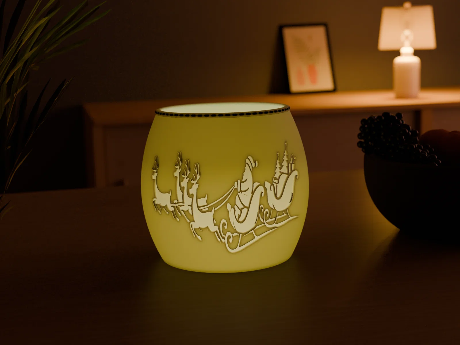 Mẫu 3D printable đèn tealight Giáng Sinh với ông già Noel trên xe trượt, tuần lộc kéo và rừng cây phủ tuyết. Khi bật nến LED, bóng đổ phát sáng ấm áp, hợp trang trí bàn/kệ và làm quà tặng.