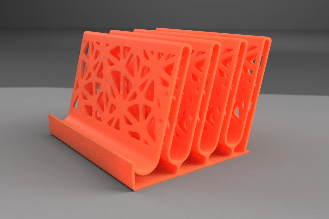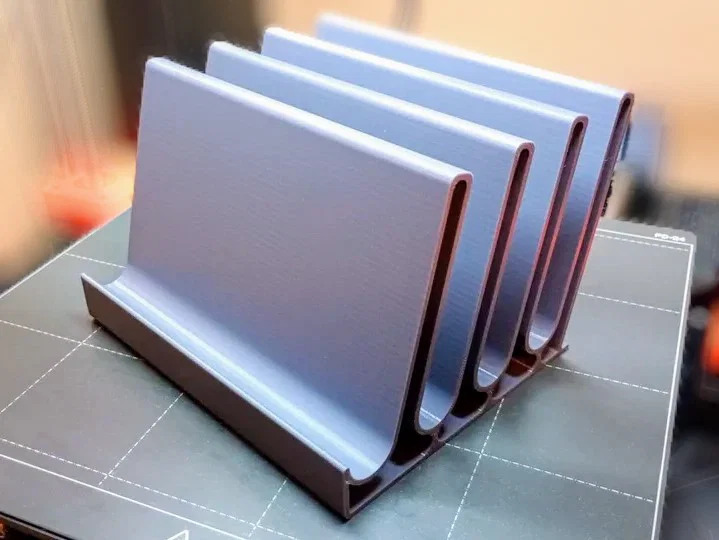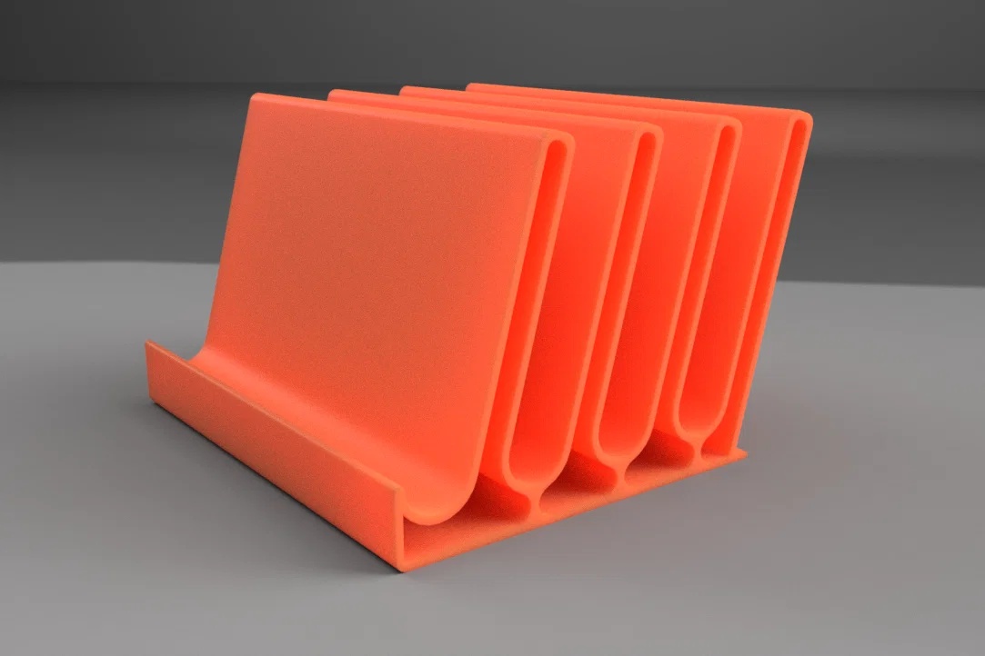 Trạm sạc tối giản với 4 khe, giúp sắp xếp và sạc nhiều thiết bị cùng lúc như điện thoại, tablet, e-reader. Mỗi khe rộng khoảng 16mm, in 3D dễ dàng không cần supports, có hốc 10mm để gắn rubber bumpers chống trượt.