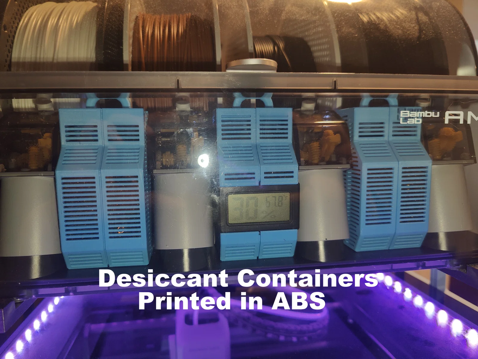 Giống nhiều thiết kế khác, mình có 2 phiên bản. Một bản có lỗ để gắn hydrometer giá rẻ (xem link Amazon bên dưới). Bản còn lại không có lỗ để tối đa lượng desiccant có thể đổ vào. Lưu ý: cần tháo các cuộn filament ra khỏi AMS thì mới tiếp cận/lấy được các hộp desiccant.