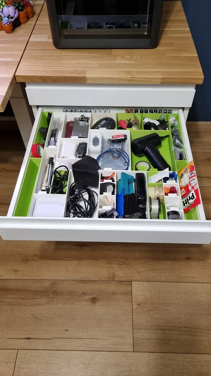 Tôi làm cái này riêng cho ngăn kéo Ikea Alex (loại tủ nhỏ) của mình để lấp đầy theo dạng lưới 6x10 + một miếng filler nhỏ (có kèm trong file), gần như theo bất kỳ cấu hình nào bạn muốn.