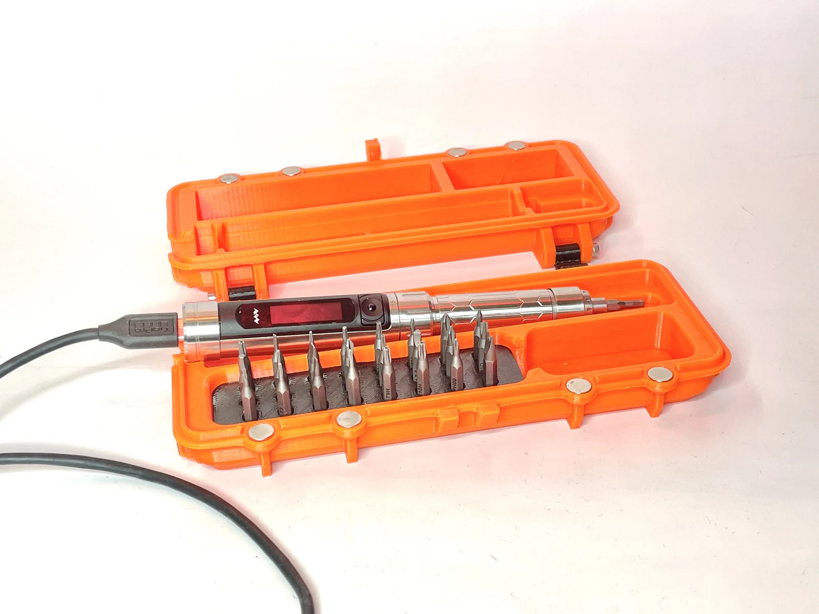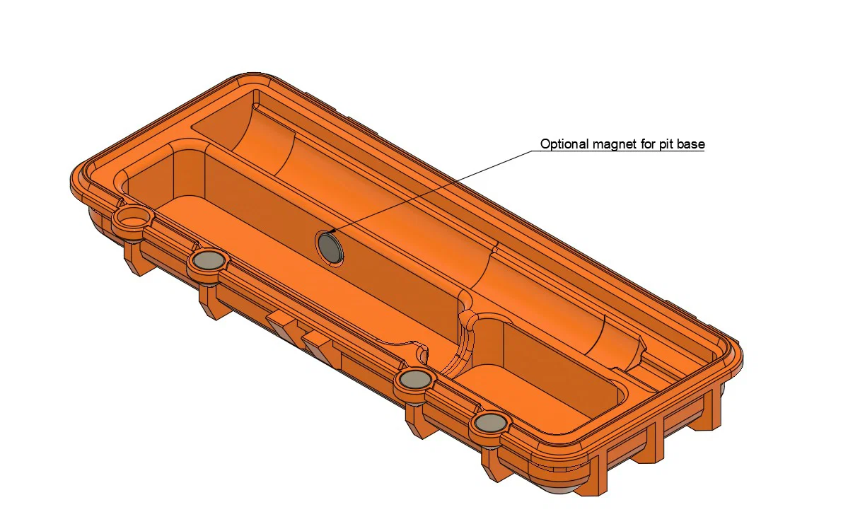 Hộp dùng nam châm dạng nút (button magnet) để đóng/mở, giúp dễ in hơn với dung sai (tolerances) khác nhau của từng máy, và “dễ thở” hơn cho các máy chưa cân chỉnh 100%.