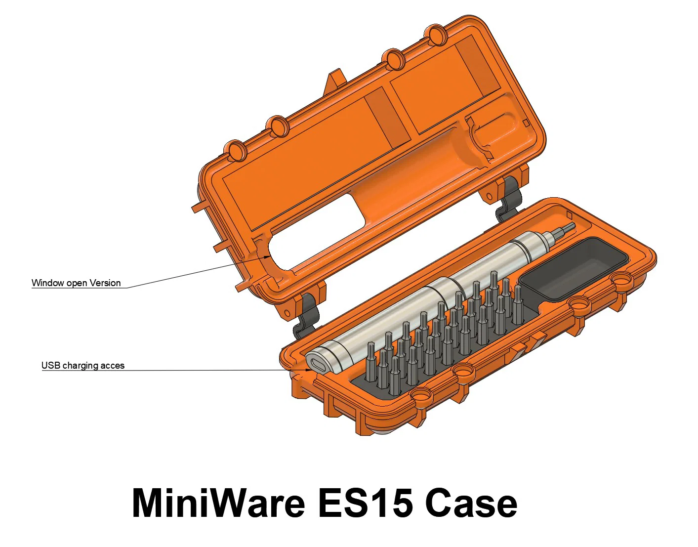 Thiết kế CASE đơn giản cho MiniWare ES15, in được trên bàn in 180mm và có thể xếp chồng với các hộp khác. Dùng nam châm nút 8x3mm để đóng/mở, dễ phù hợp dung sai nhiều máy. Có 2 phiên bản (có/không cửa sổ & cổng sạc USB).