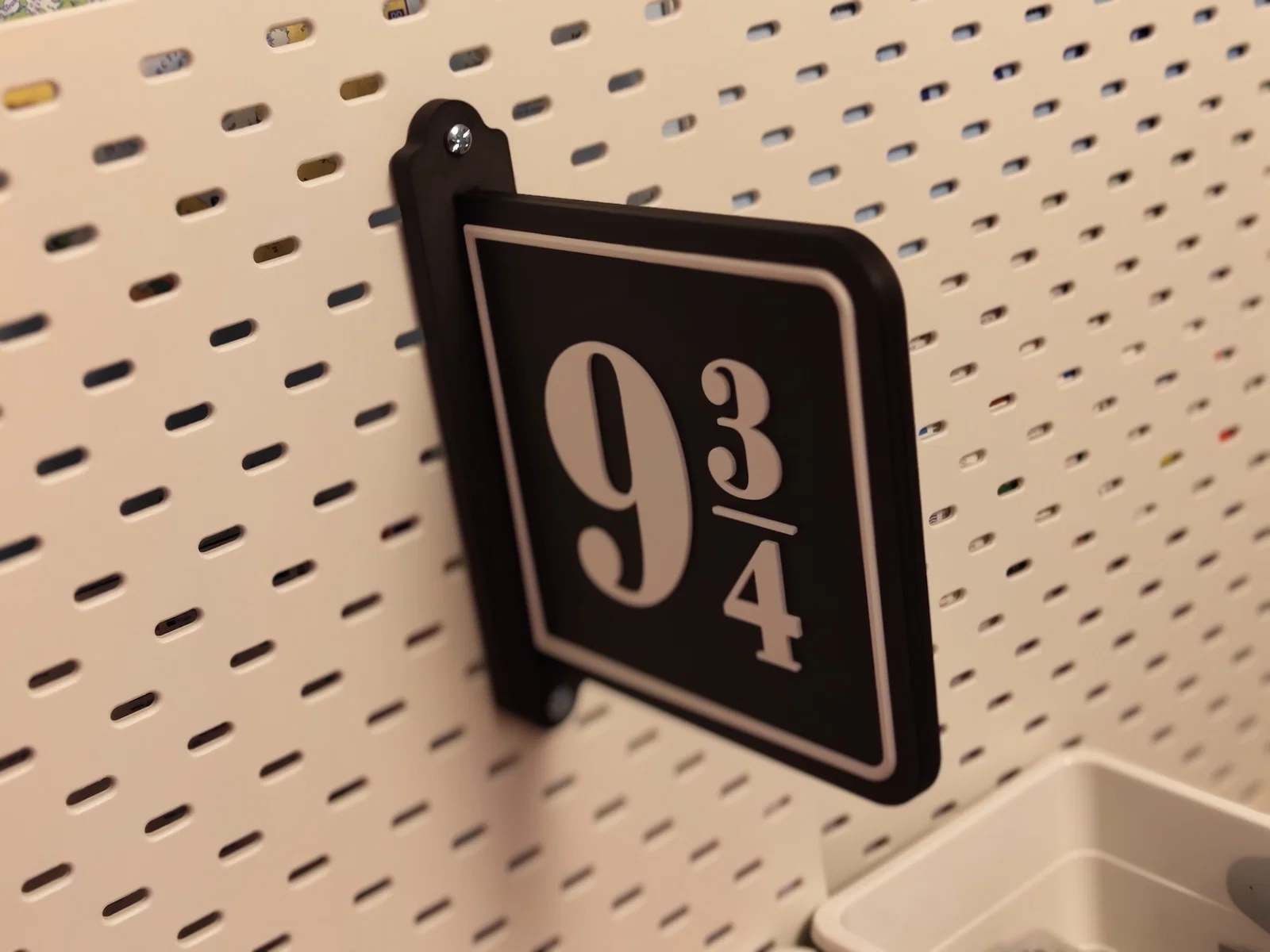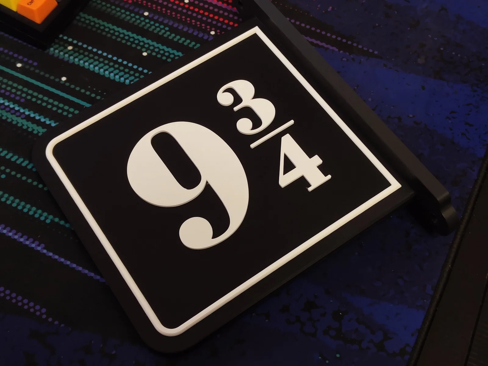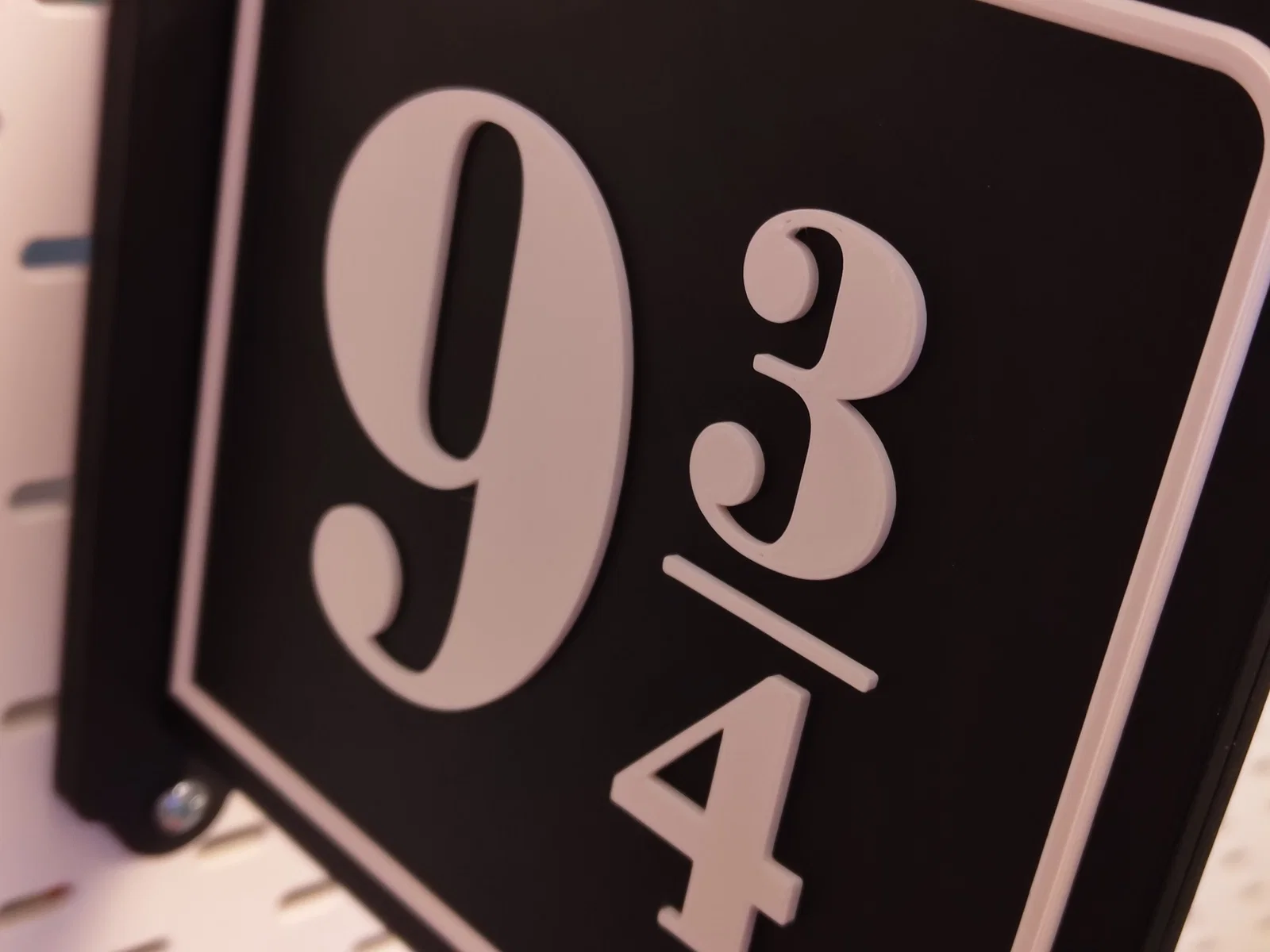 Bảng hiệu sân ga tàu 9 3/4 lấy cảm hứng từ Harry Potter/Hogwarts Express, tương thích Ikea Skadis. Có thể bắt vít lên tường hoặc nhúng nam châm (có remix). Hỗ trợ đổi màu chữ bằng color change trong PrusaSlicer.