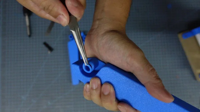 Trong khung cánh mở rộng (extending wing frame) có một miếng support nhỏ được tích hợp sẵn, nằm ở chỗ ống trụ (cylinder) chạm mặt bàn in (build plate) — gỡ miếng này ra. Có hình minh họa.
