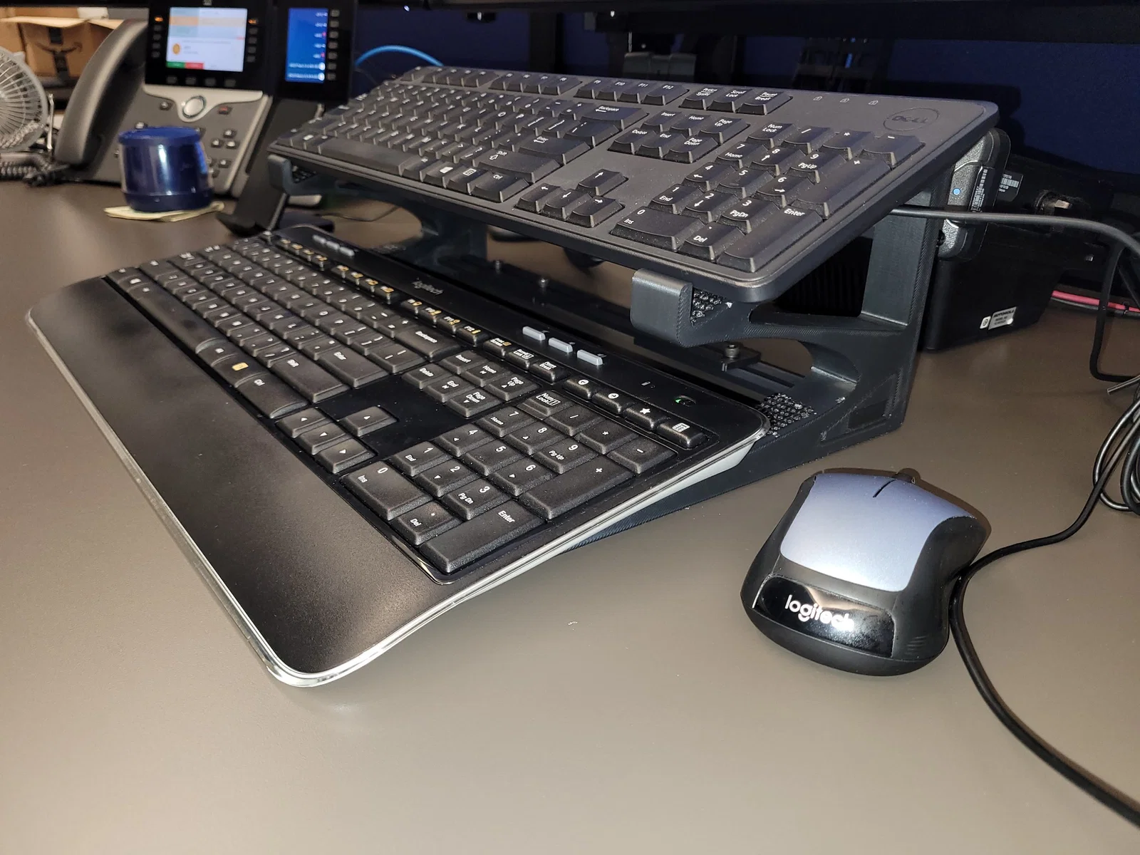 Đây là phiên bản cải tiến của mẫu giá đỡ bàn phím từ người dùng KI4LLF trên Thingiverse. Thiết kế này bổ sung khả năng điều chỉnh độ nghiêng và khoảng cách, giúp bàn phím nằm ở vị trí thuận tiện nhất cho người dùng.