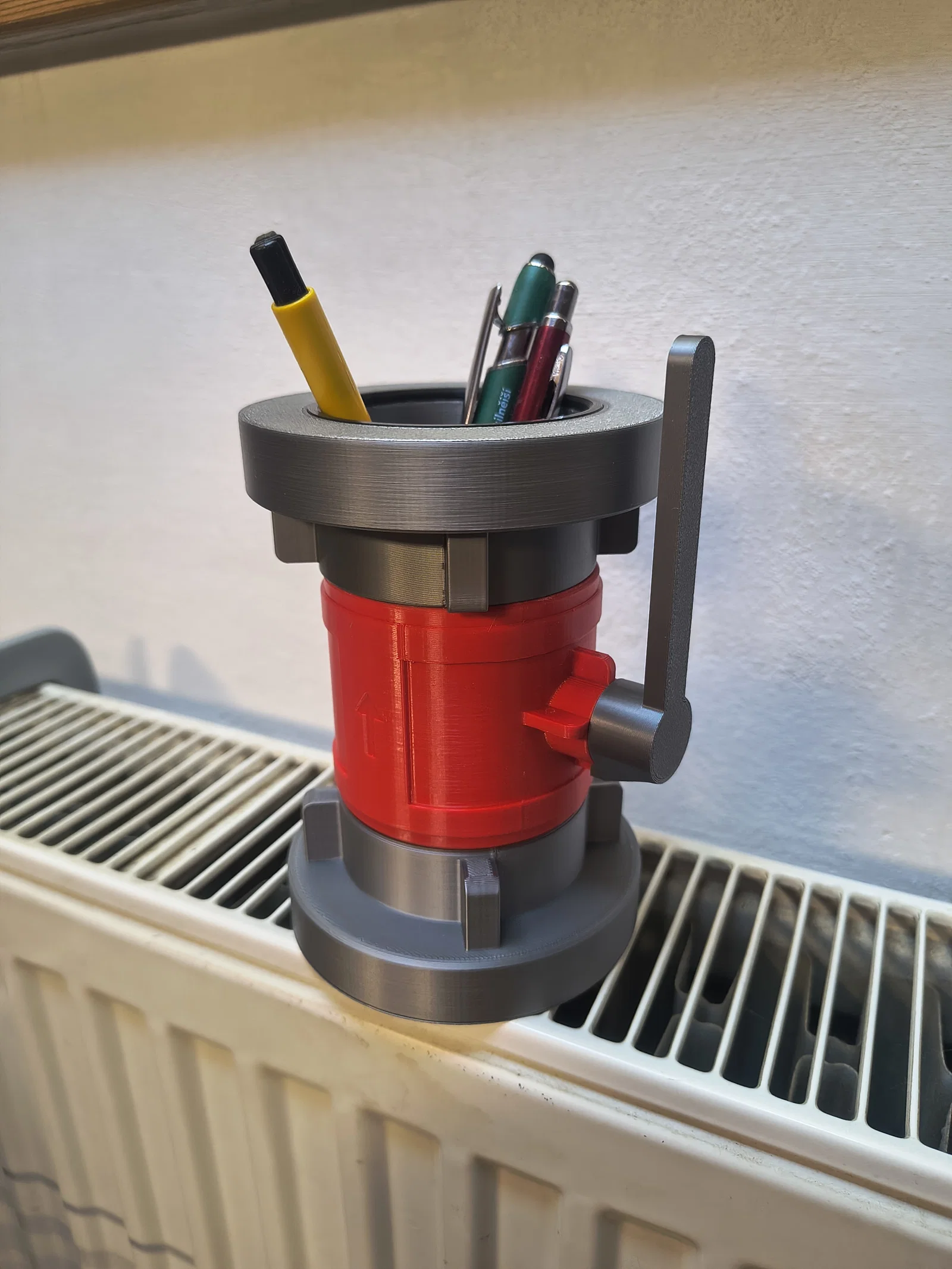 Ống đựng bút chì dạng nắp khóa (closure) của vòi chữa cháy. Mình làm theo gợi ý của vợ để làm quà tặng cho đội chữa cháy tình nguyện ở địa phương. Chỉ cần in rồi dán lại, hoặc có sẵn phiên bản model in nguyên khối. In bằng PLA phổ thông (đỏ Aurapol, bạc và đen Worcam). Có kèm file nguồn để chỉnh sửa thêm trong FreeCAD 1.0.