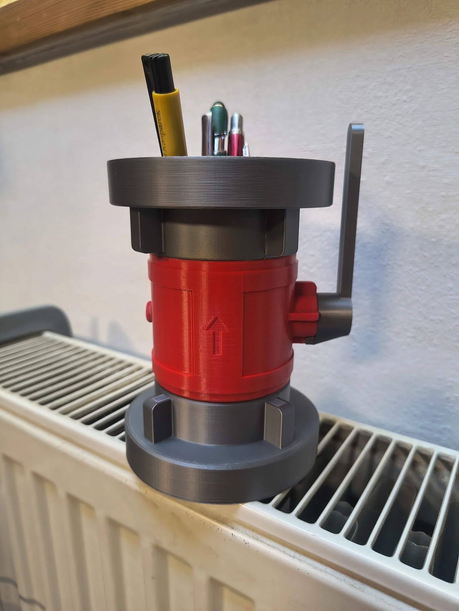 Ống đựng bút chì mô phỏng nắp khóa của vòi chữa cháy, làm quà cho đội chữa cháy tình nguyện. Có bản in ghép hoặc in nguyên khối. In bằng PLA phổ thông và kèm file nguồn FreeCAD 1.0 để chỉnh sửa.