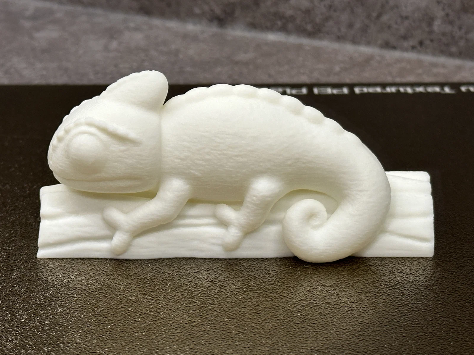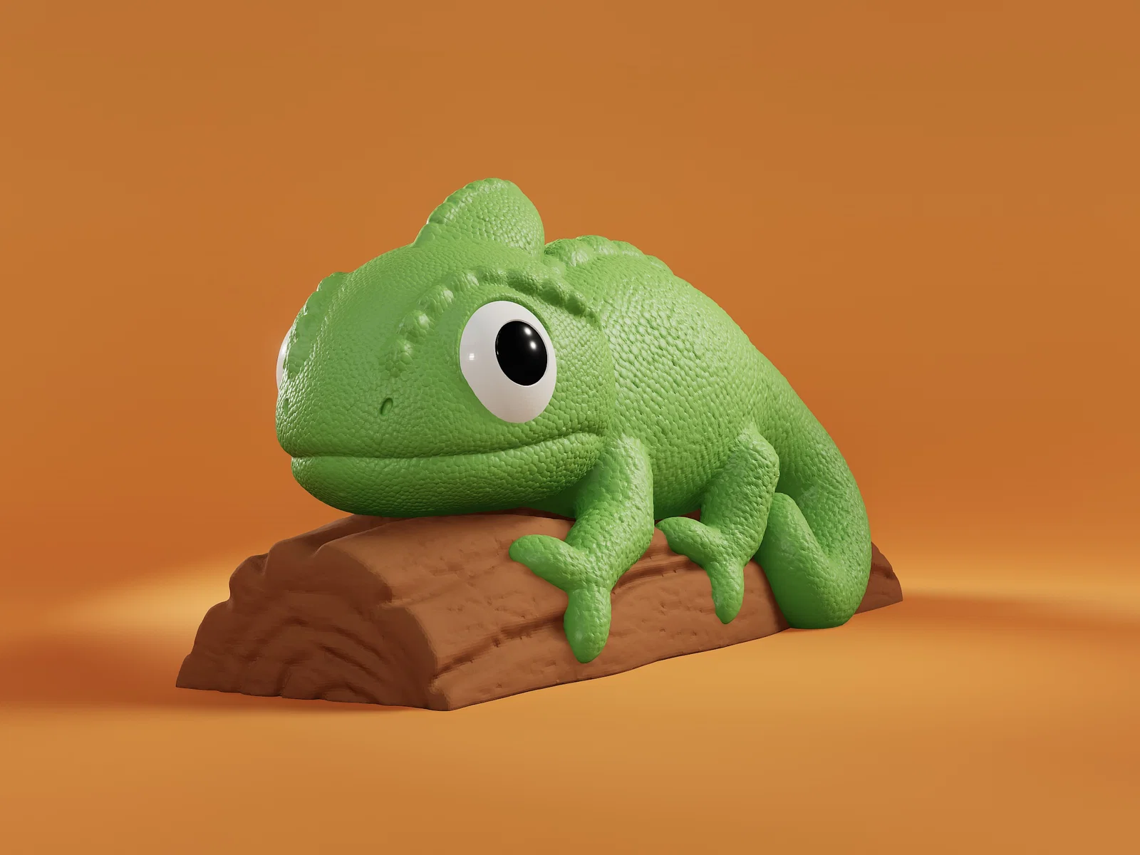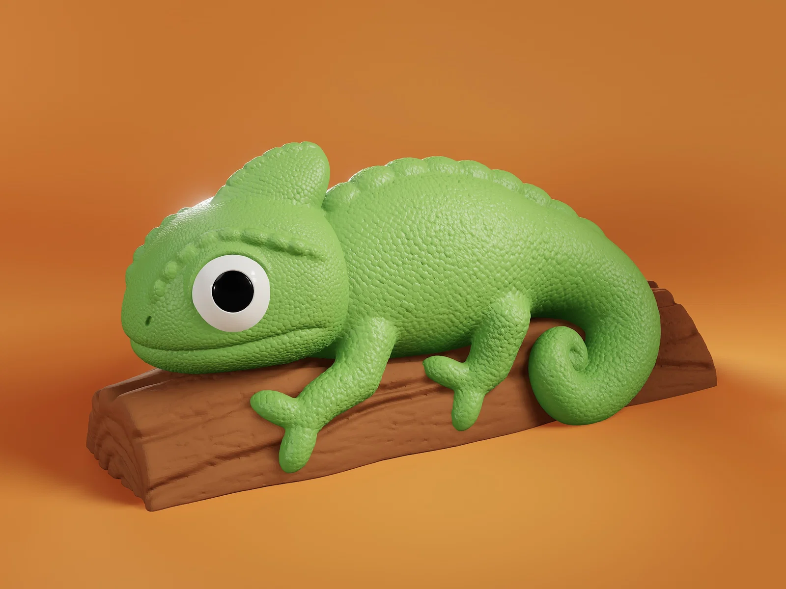 Chameleon Emil là mẫu 3D tắc kè hoa dễ thương đang đi trên một khúc cành gỗ. Da xanh có texture, mắt to và đuôi cuộn tạo điểm nhấn, rất hợp để sưu tầm hoặc trưng bày trên bàn.