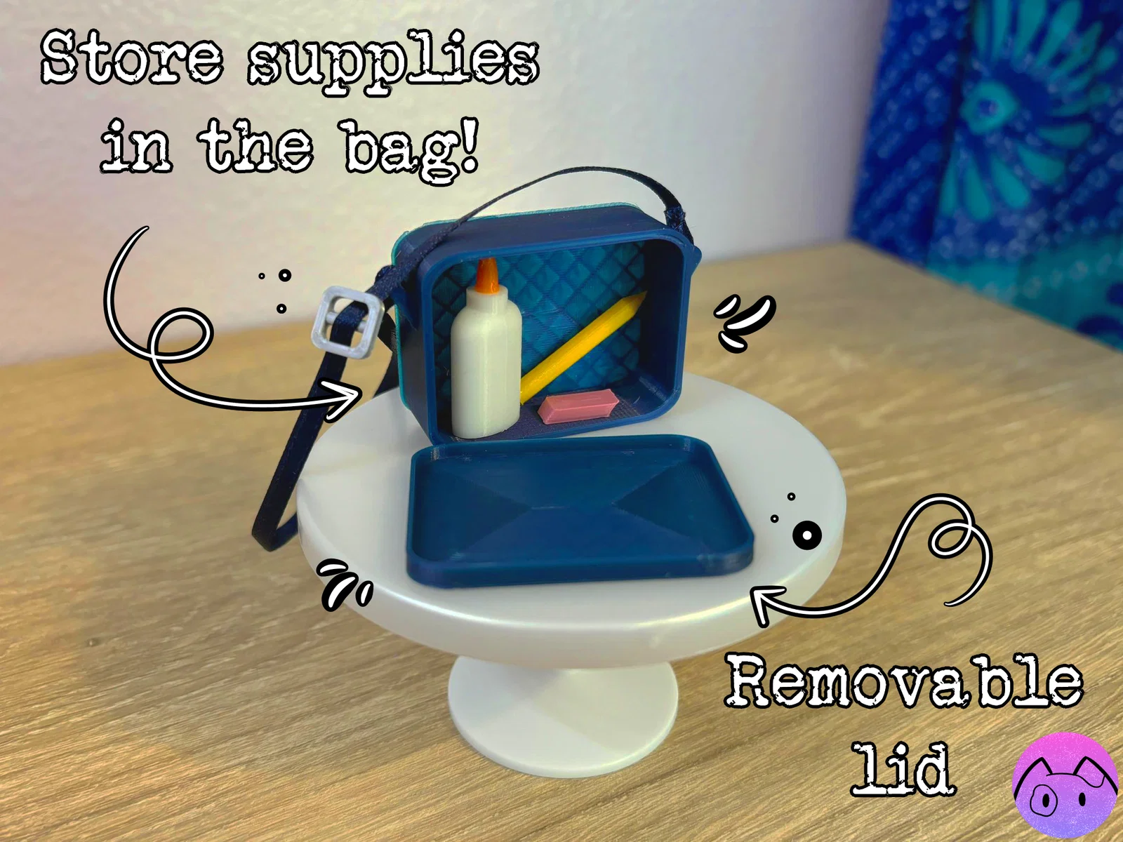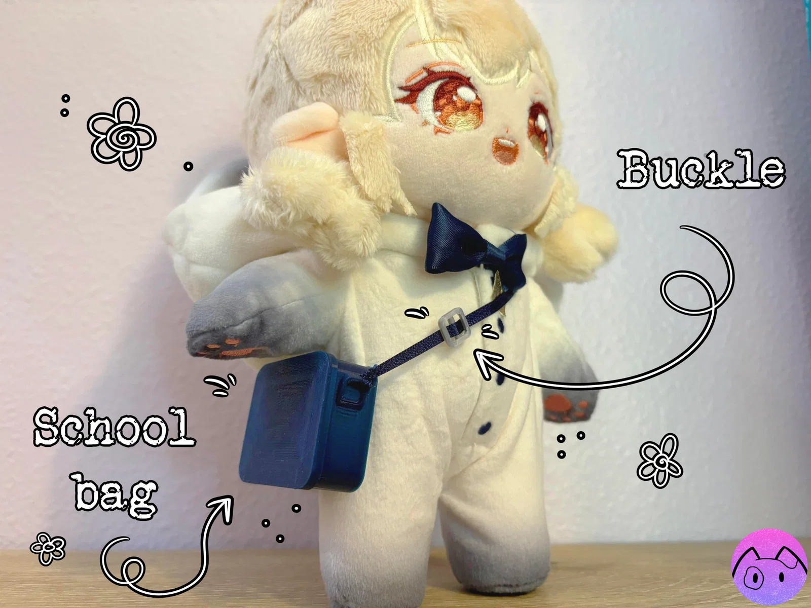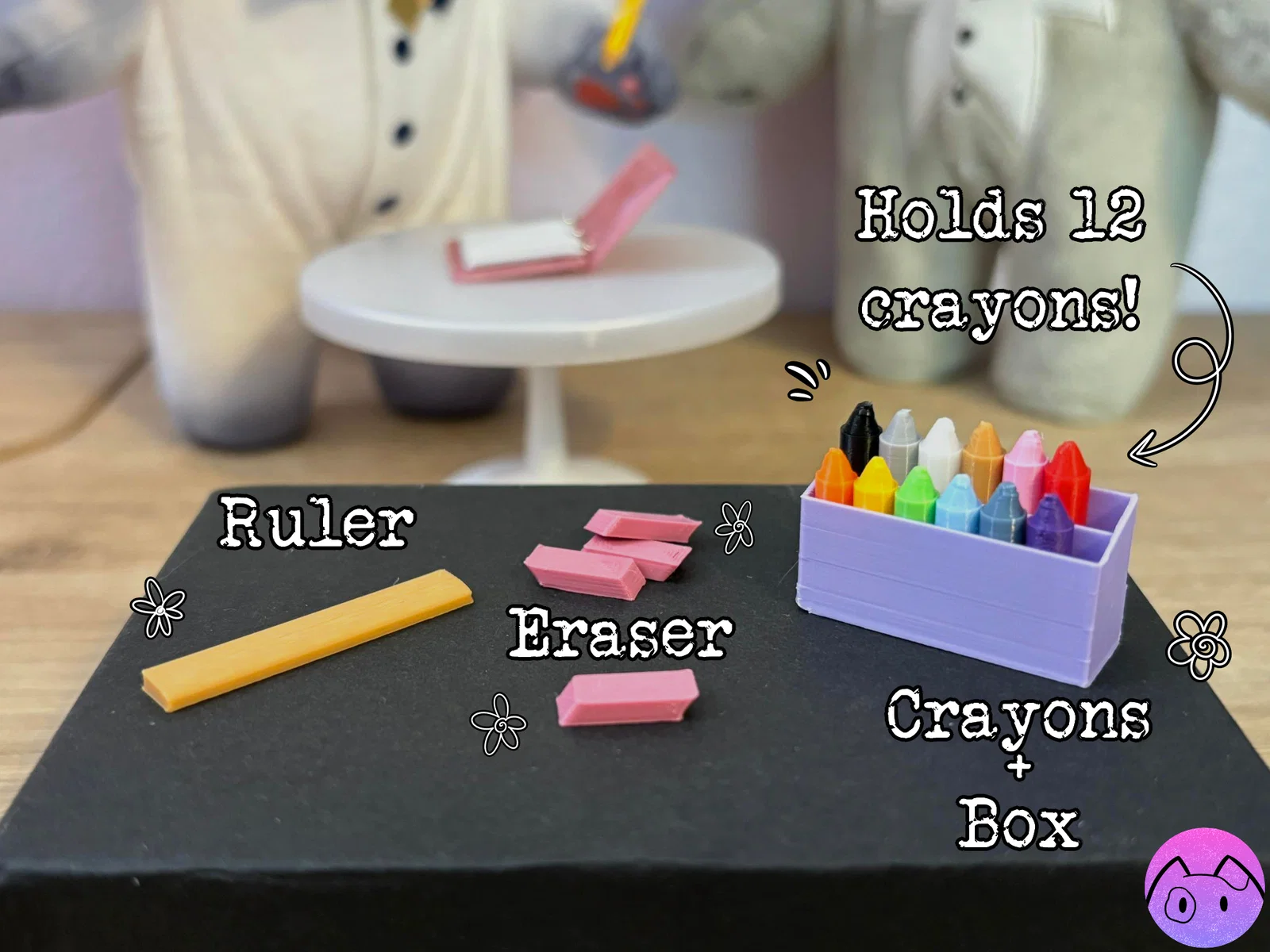 Bộ mini lấy cảm hứng từ đồ dùng học tập cho búp bê/plush doll: cặp, bút sáp, hộp bút sáp 12 cây, bút chì, thước, gôm, chai keo và bìa sổ. Scale theo plush doll 20cm, có thể cần rescale.
