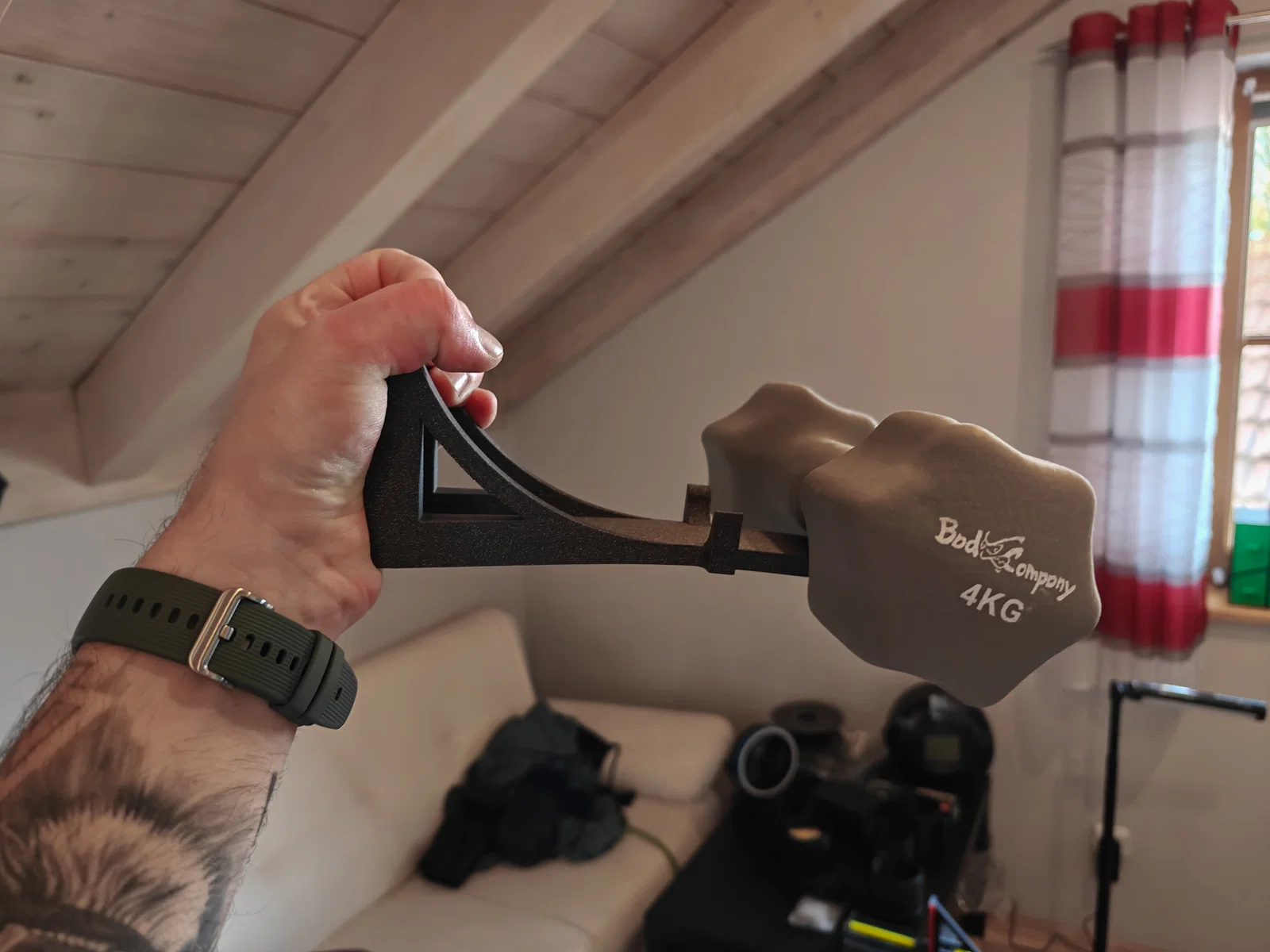 Vì mình chưa thấy ở đâu có sẵn một Wandhalter (giá treo tường) cho DJI AIR 3(S), nên mình tự thiết kế một cái. Drone vừa khít hoàn hảo và như bạn có thể thấy ở tấm hình với quả tạ 4kg, nó giữ trọng lượng của drone một cách dễ dàng.