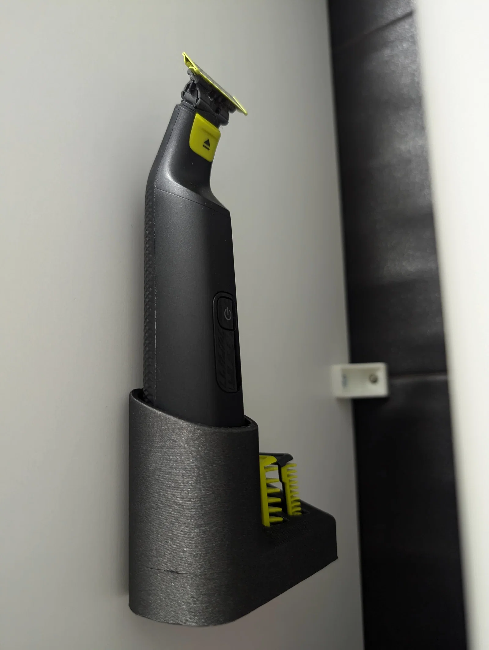 Cái holder này được thiết kế ưu tiên tính thực dụng, làm riêng cho Philips ONE BLADE PRO 360. Nó giúp giữ máy tỉa gọn gàng, chắc chắn và dễ lấy, đồng thời làm khu vực cạo/tỉa của bạn nhìn sạch sẽ, ngăn nắp hơn. Phần đáy có chừa khe cho dây sạc, nên chỉ sạc được khi holder được dán cố định lên tường bằng băng keo dán hai mặt.